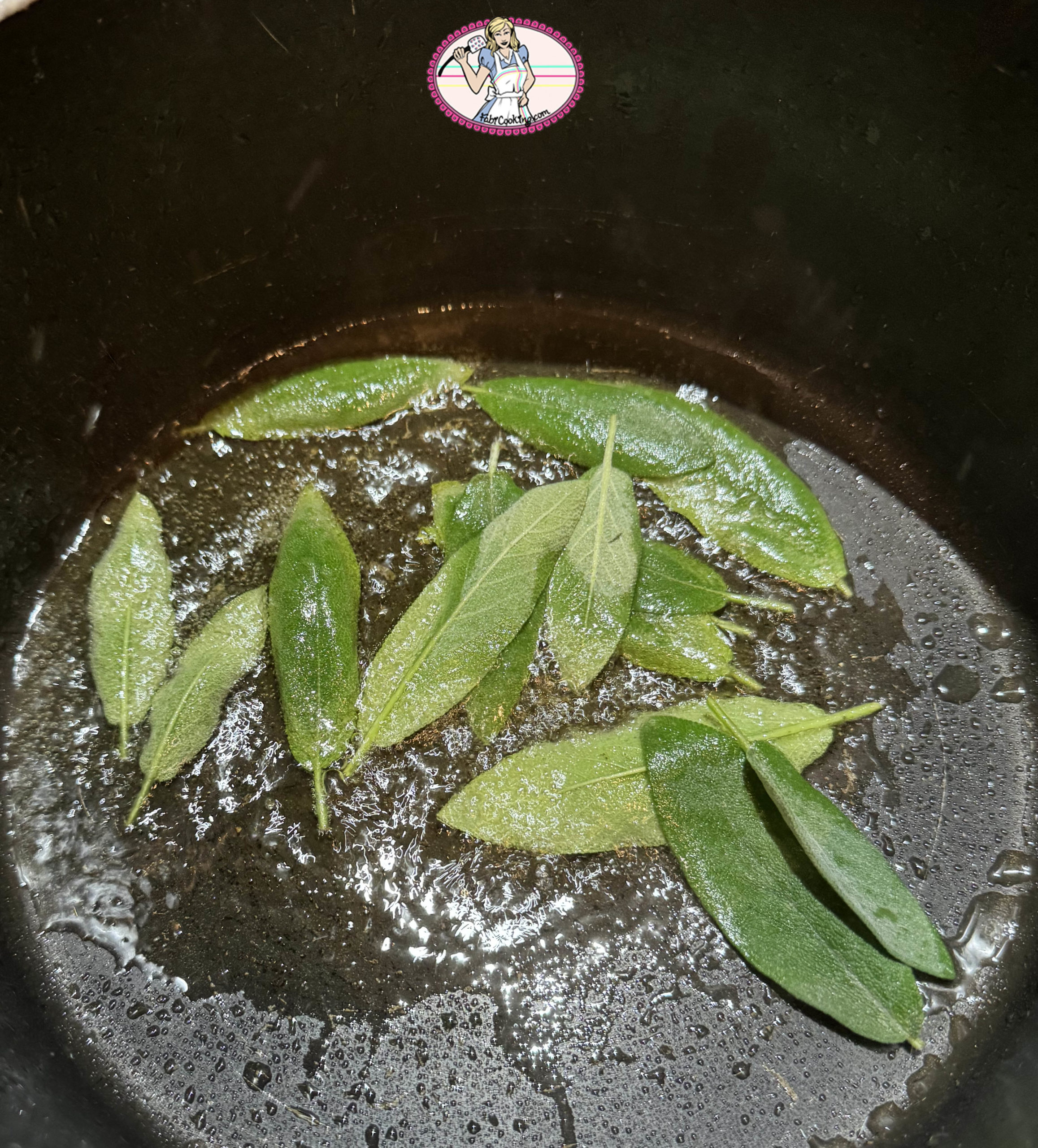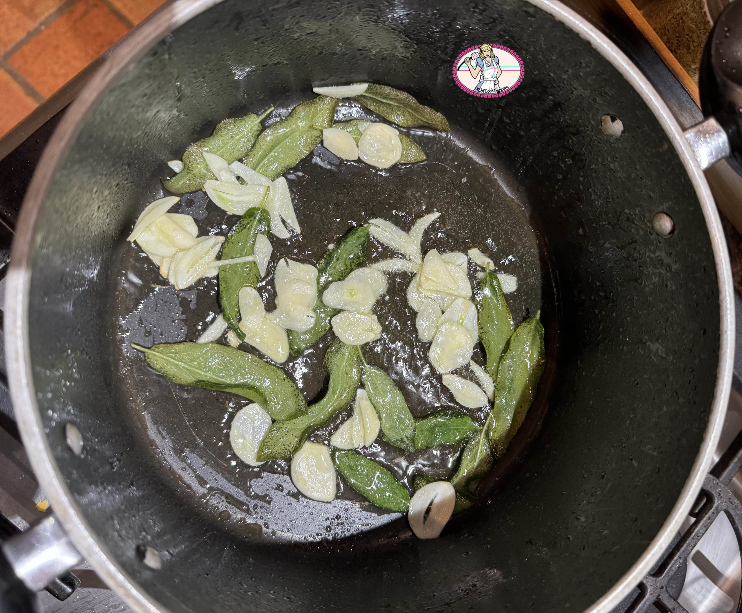 - Aromatiser l’huile : Dans une grande poêle, faire chauffer 3 cuillers à soupe d’huile d’olive à feu moyen. Laver et sécher les feuilles de sauge fraiches. Les faire revenir doucement avant d’ajouter l’ail coupé en fines lamelles puis laisser infuser doucement l’huile pour parfumer le tout sans brûler l’ail.