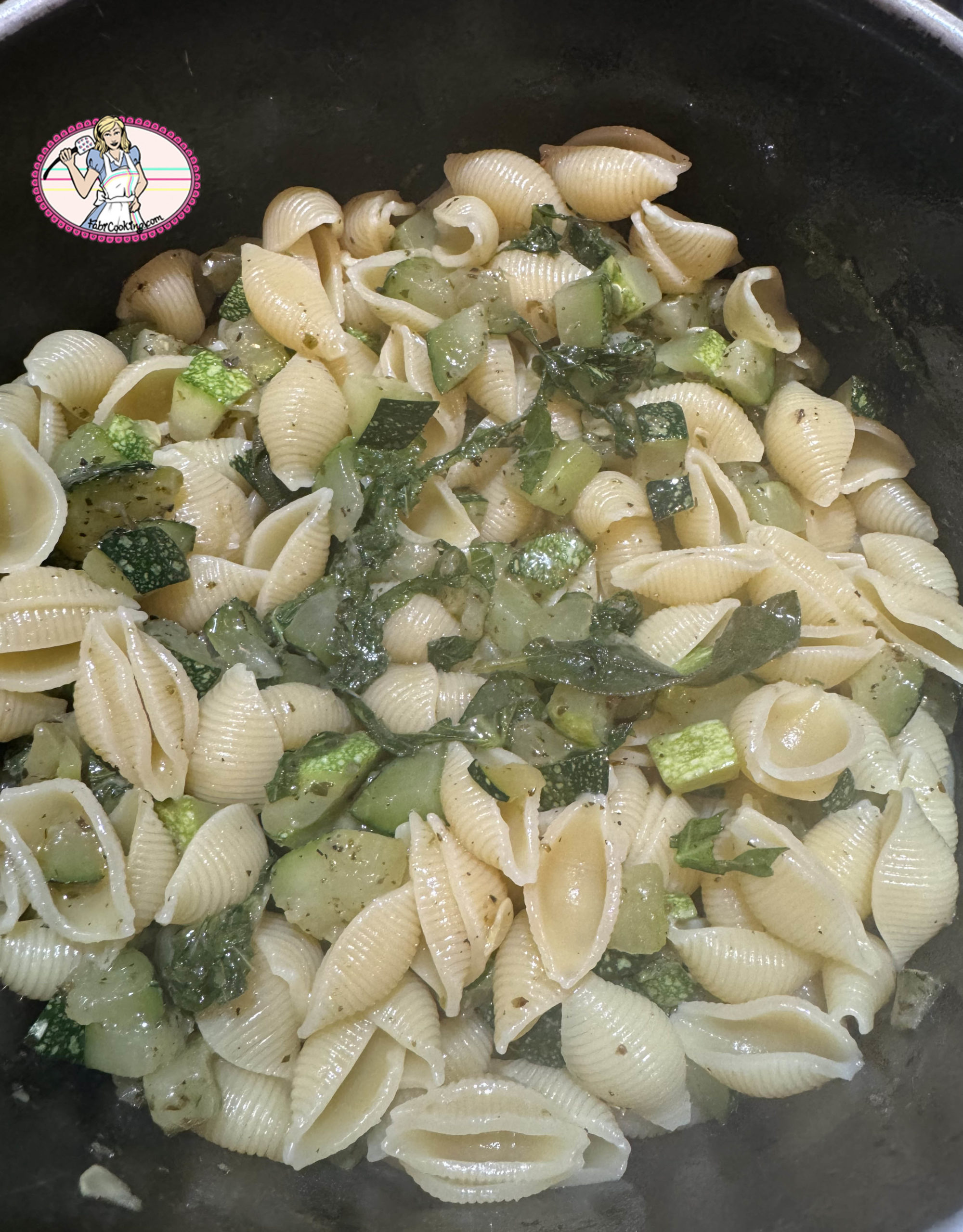 5. Incorporer les pâtes : Ajouter les conchiglie égouttées dans la casserole contenant l’huile parfumée à la sauge et à l’ail. Joindre les courgettes . Mélanger délicatement pour enrober les pâtes de la sauce parfumée. Si nécessaire, ajouter un peu de l’eau de cuisson réservée pour obtenir une texture plus onctueuse et un peu d’huile d’olive supplémentaire.