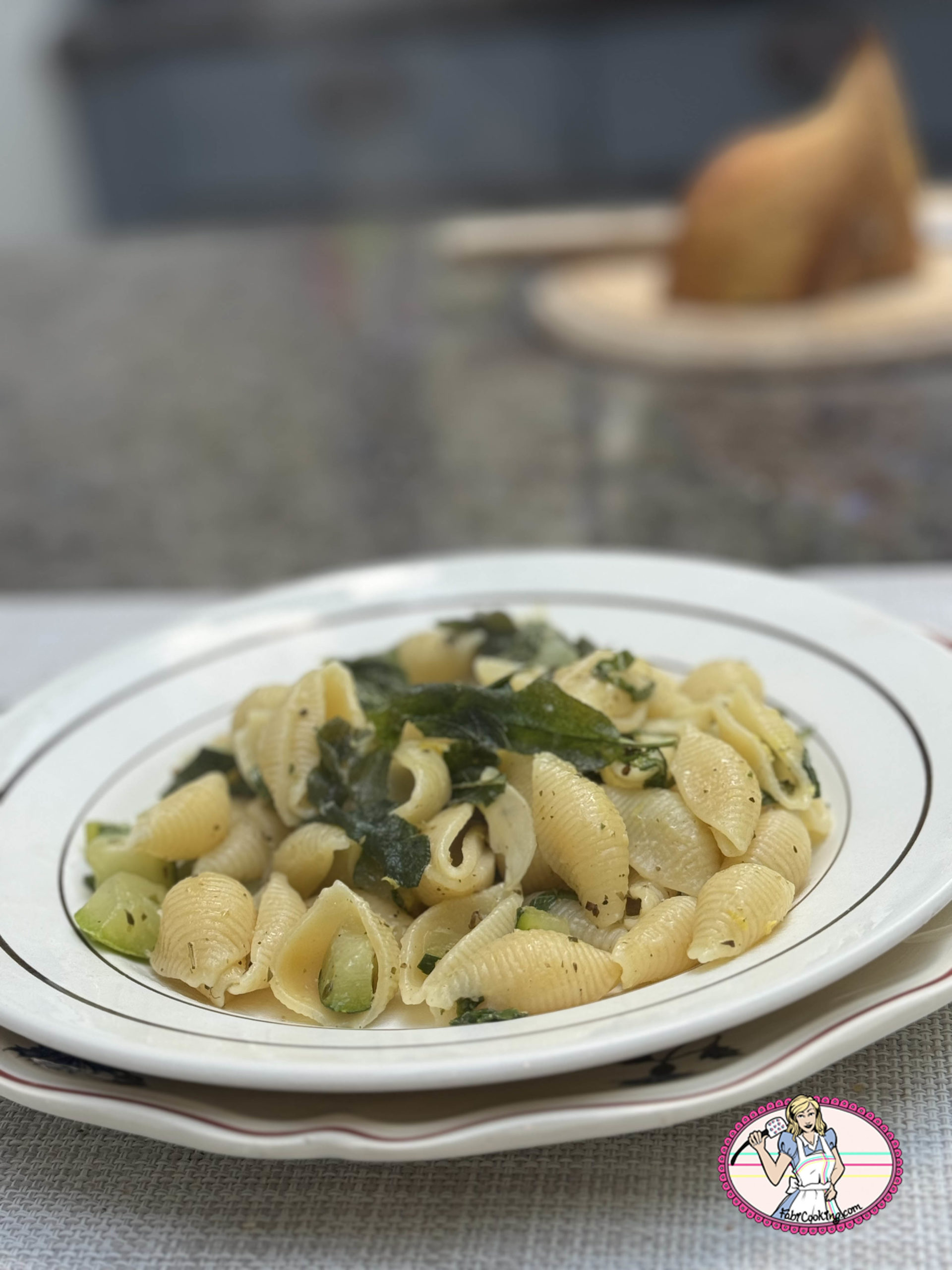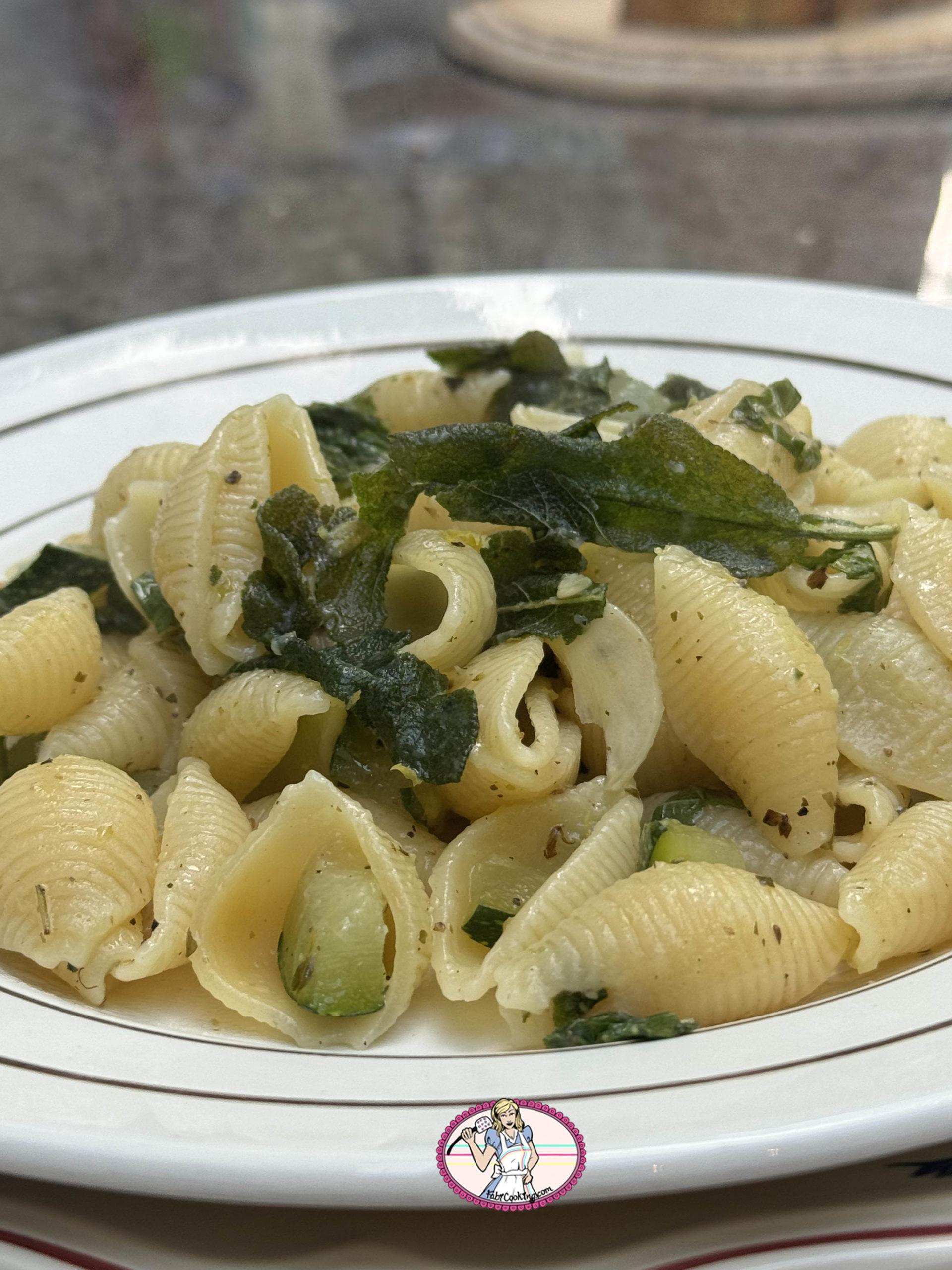 Je vous laisse découvrir ma recette de conchiglie à la sauge, ail et aux courgettes …..et la préparer en 15 mn chrono!