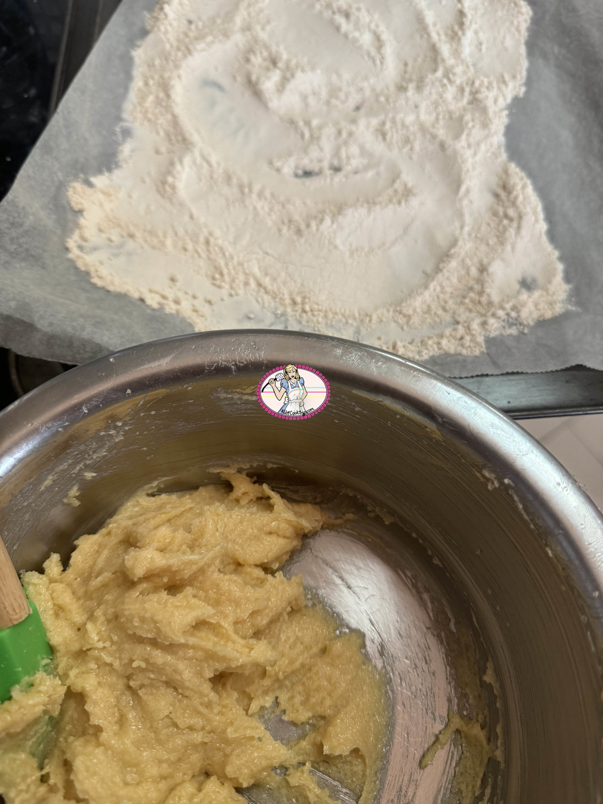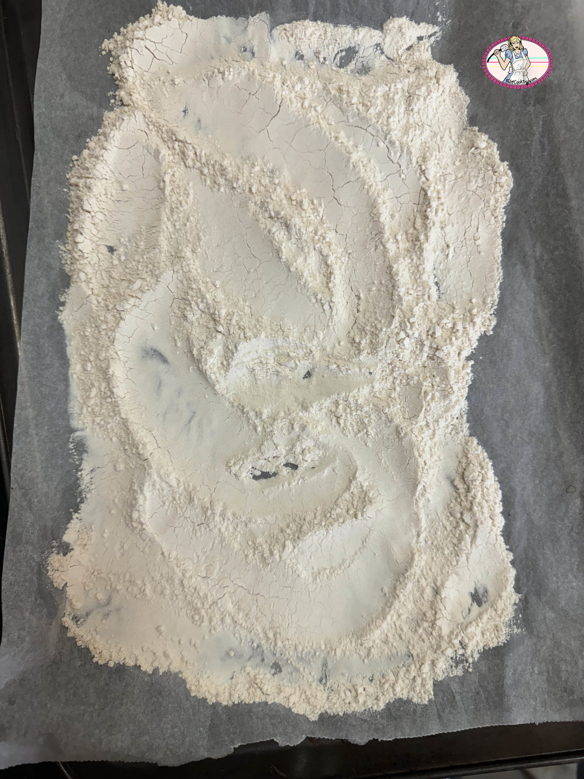 1. Le four étant chaud, on en profite pour torréfier la farine, par précaution puisqu’elle ne va pas cuire. Il suffit de l’étaler, tamisée, sur une feuille de papier cuisson placé sur une plaque à pâtisserie et de l’ enfourner pendant 10 mn.