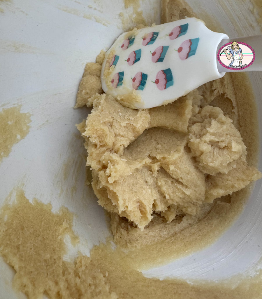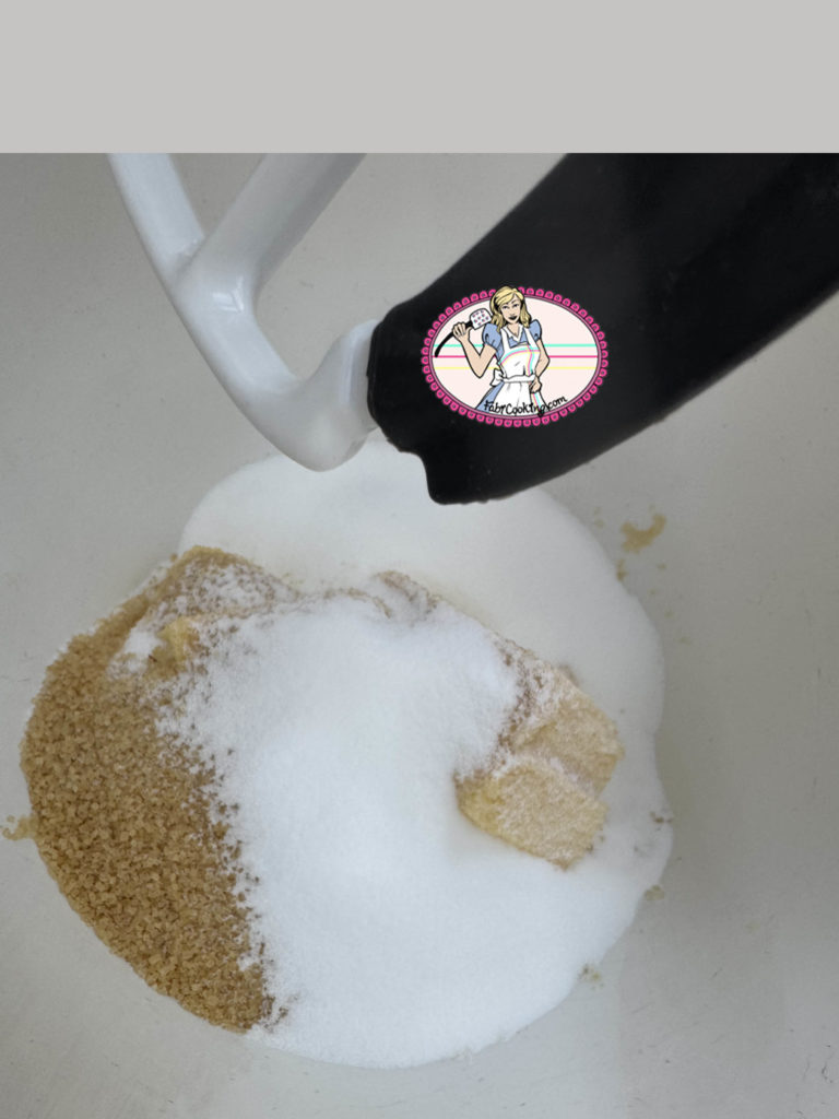 - Dans le bol du robot, pommader le beurre ( à la feuille) puis incorporer les deux sucres, le bicarbonate de soude et le sel. Fouetter pendant 2 mn et racler le fond une à deux fois jusqu’à ce que le mélange devienne clair et un peu mousseux.