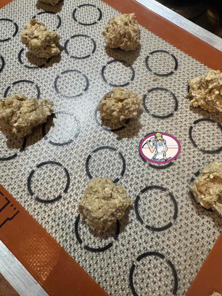 6. Sur une plaque à pâtisserie recouverte d’ une feuille de papier cuisson ou d’ un tapis en silicone, faire de petits tas de pâte à cookies en les espaçant. J’ai fait plusieurs tests: si vous préférez les cookies un peu mous à coeur, ne pas aplatir la pâte. Si comme moi, vous préférez un peu de croquant sur les bords, aplatissez les avec une cuiller ou simplement avec vos doigts. Enfourner à four préchauffé à 180°. Compter entre 12 à 14 mn de cuisson selon la taille de vos cookies, leur forme et la cuisson » à point » ou » bien cuit ».