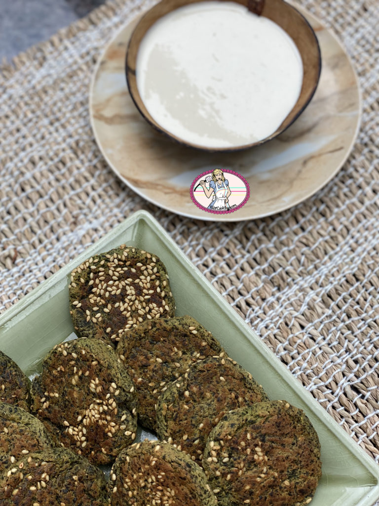 Ils se dégustent accompagnés d’une sauce à base de tahiné citronnée et aillée et rendue plus liquide avec l’ajout d’ un peu d’eau. En accompagnement, quelques tomates, du persil, un peu d’oignon et du piment. Moi, j’adore!