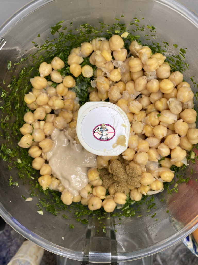 2. Rincer et égoutter les pois chiches. Les placer dans la cuve avec l’ail préalablement écrasé avec 1/2 cuiller à café de sel, les épices, la tahiné. Actionner 3 à 4 minutes avant de verser le jus de citron.