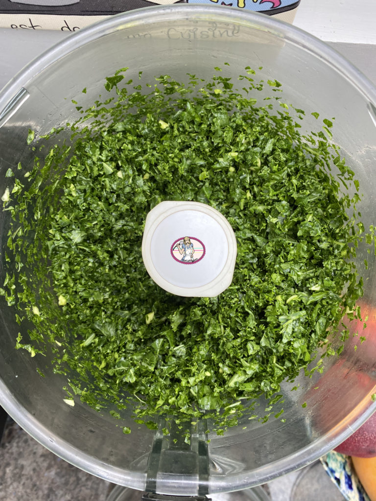 - Rincer le chou kale et le passer à l’essoreuse à salade. Découper en lanières d’un centimètre et hacher dans le robot coupe