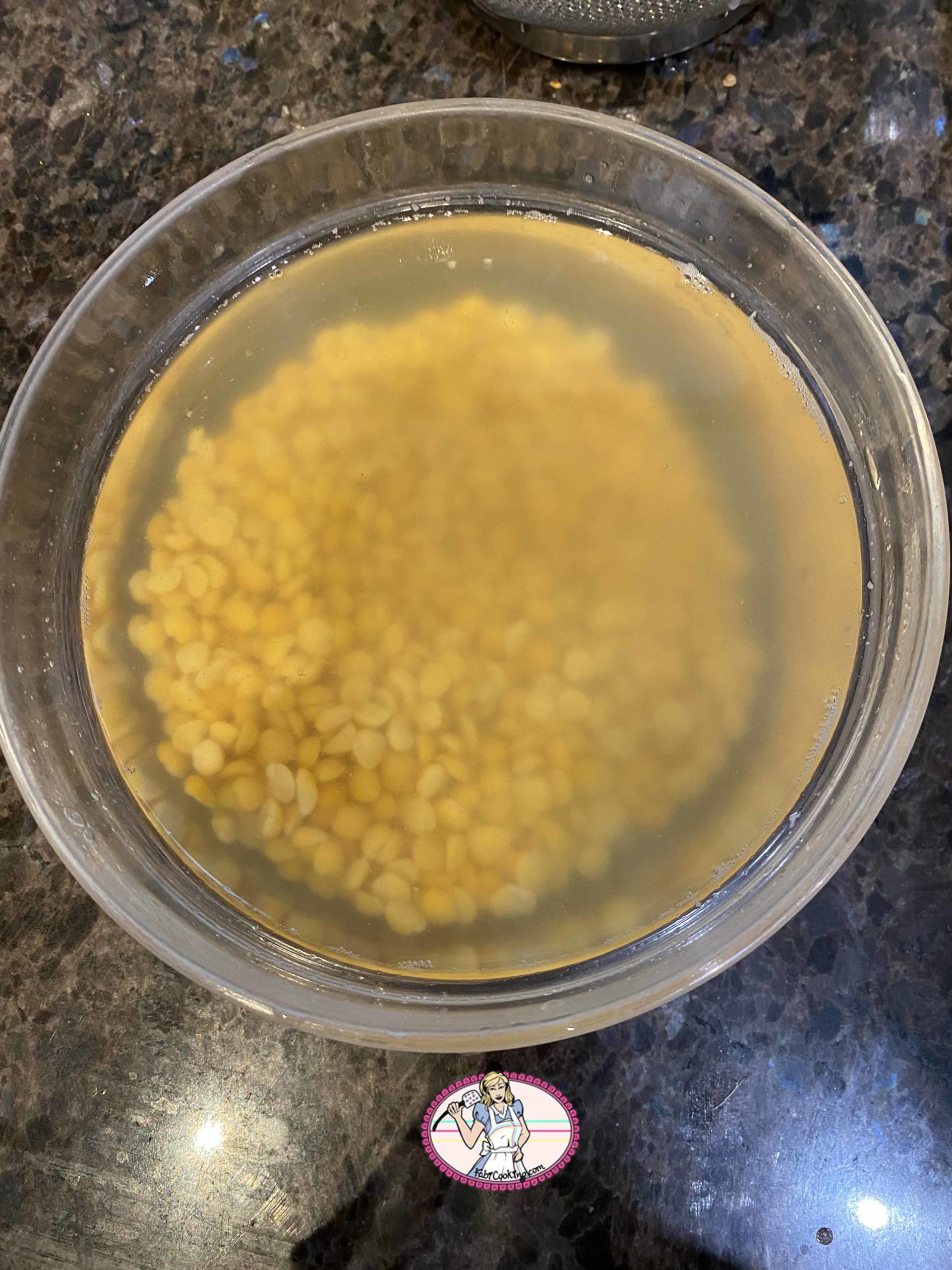 - Plonger 15 mn les pois cassés jaunes dans de l’eau chaude. Couvrir.