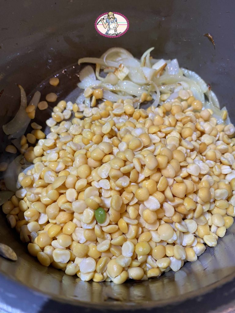 3. Faire revenir l’oignon et les gousses d ‘ail dans un petite cuiller à soupe d’huile d’olive. Ajouter les pois cassés jaunes.