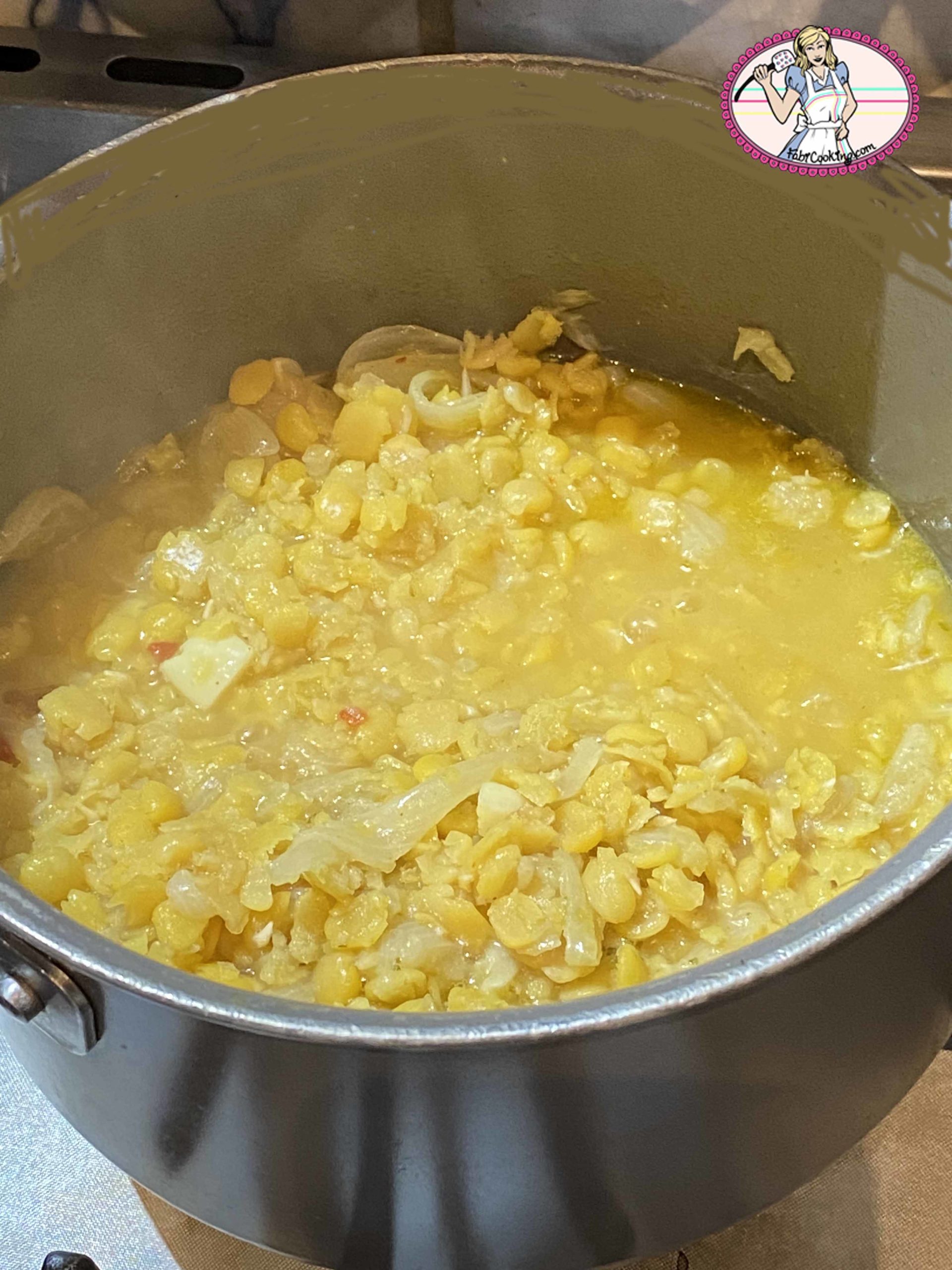 4. Couvrir avec l’eau et ajouter le bouillon cube. Mener à ébullition puis baisser le feu. Cuisson 40 mn environ. Surveiller au bout de 30 mn pour voir si cela est nécessaire de rajouter un peu d’eau. Le temps de cuisson dépend de la qualité des pois cassés jaunes.