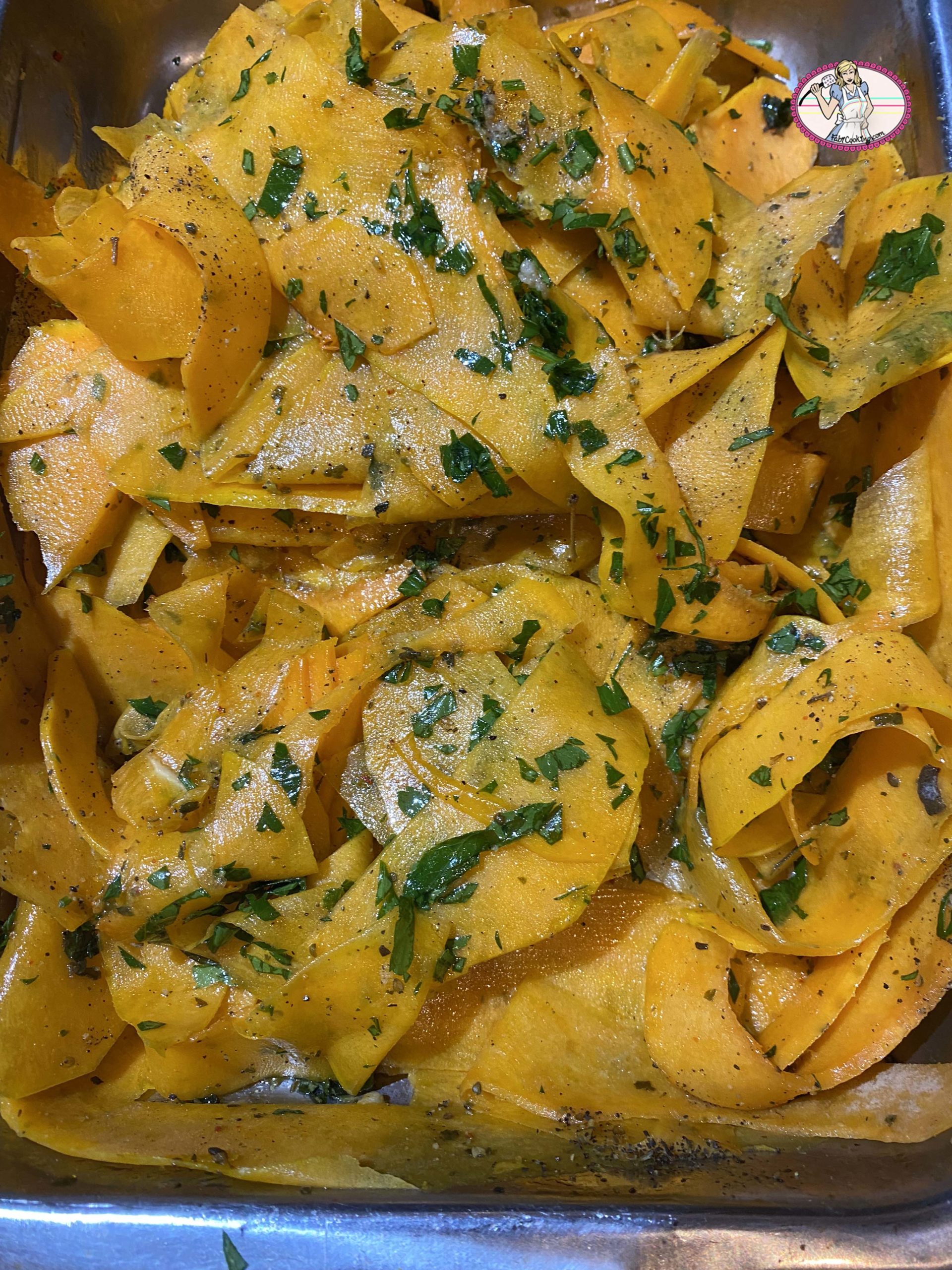 1. La peau de la courge butternut reste très dure même après cuisson, il faut donc l’éplucher. Petite astuce pour vous faire gagner un peu de temps et faciliter la découpe : placer le butternut 4 mn au micro ondes à pleine puissance. Puis le placer à plat sur le plan de travail et l’ éplucher avec un économe. Pour notre recette, il est préférable ensuite d’utiliser une mandoline pour trancher assez finement la courge. Vous devez obtenir cela