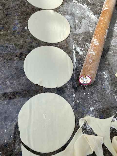 4. Disposer 1 cuillère à café de farce sur chaque cercle de pâte.