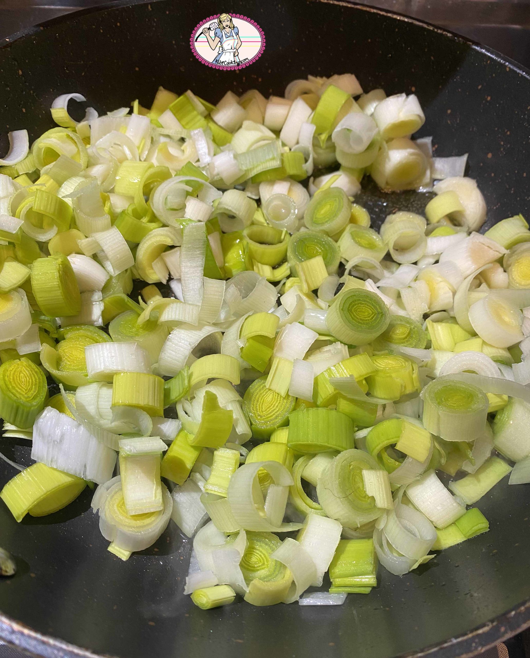 - Couper en rondelles les poireaux, laver et essorer. Verser une cuiller d’huile dans une poêle et faire revenir à feu moyen pendant une dizaine de minutes et jusqu’à ce qu’ils soient fondants mais pas trop cuits. Réserver.