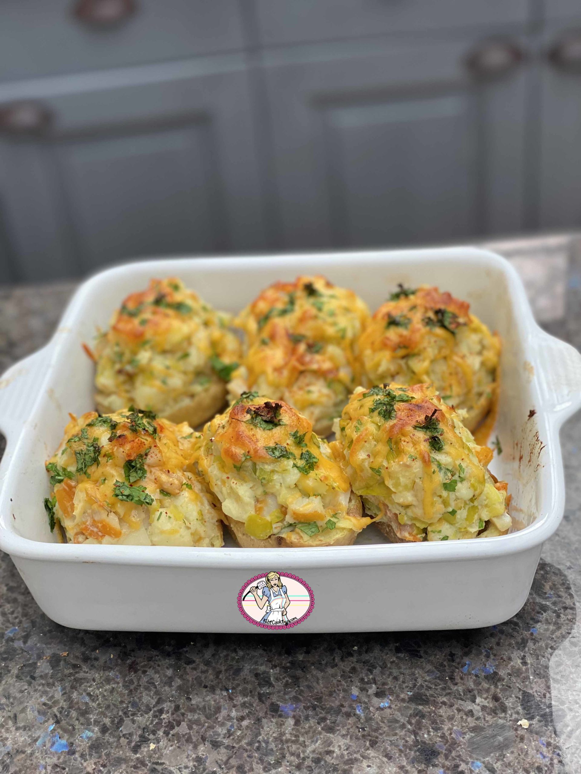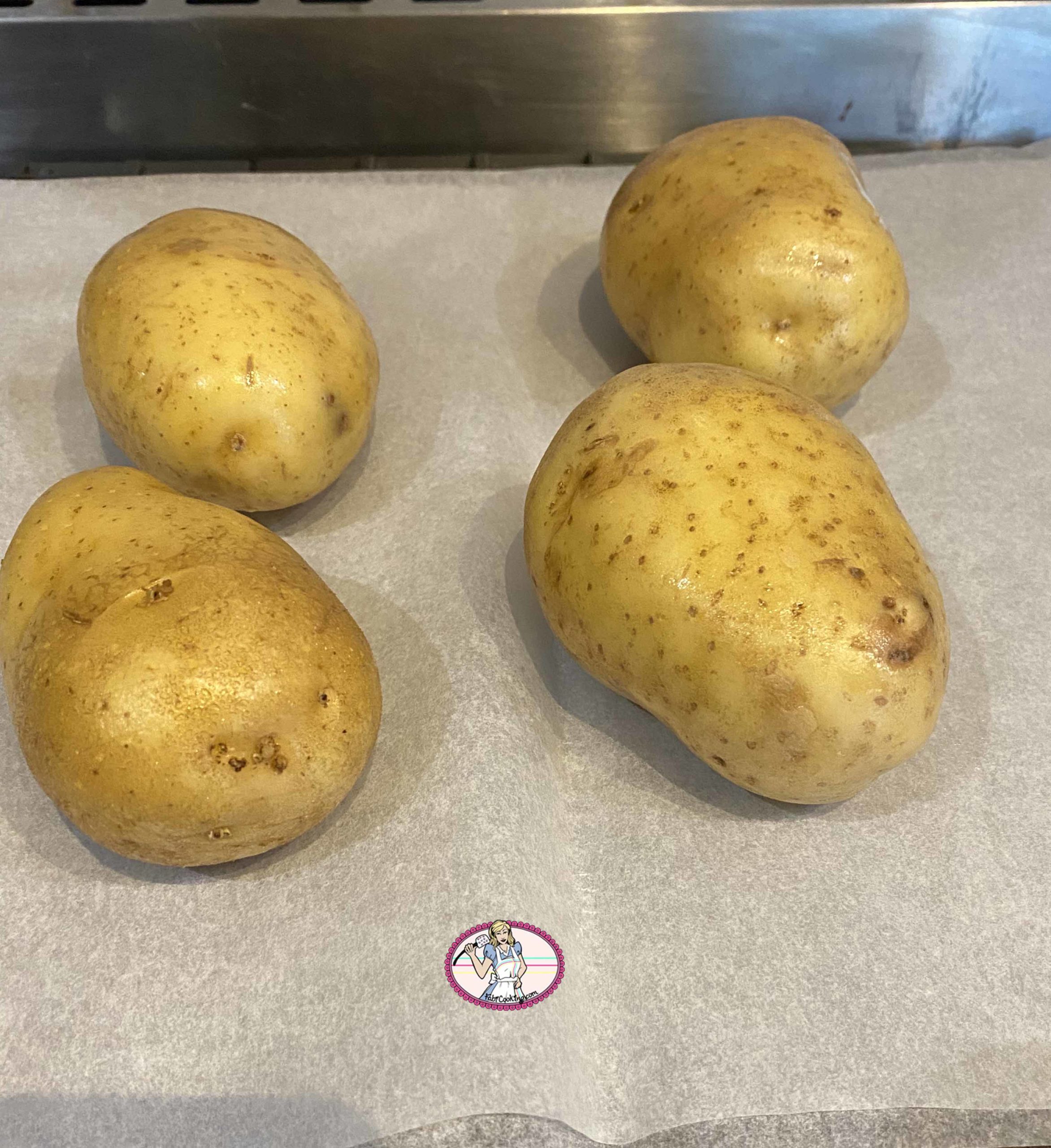 3. Préchauffer le four à 200°. Laver les pommes de terre et les piquer avec une fourchette sur toute leur surface. Placer sur une feuille de papier cuisson et enfourner pendant 1 heure en les tournant au bout de 30 mn. J’ai testé la cuisson d’une pomme de terre au bout de l’heure en la coupant en deux mais j’ai du prolonger la cuisson de 10 mn.