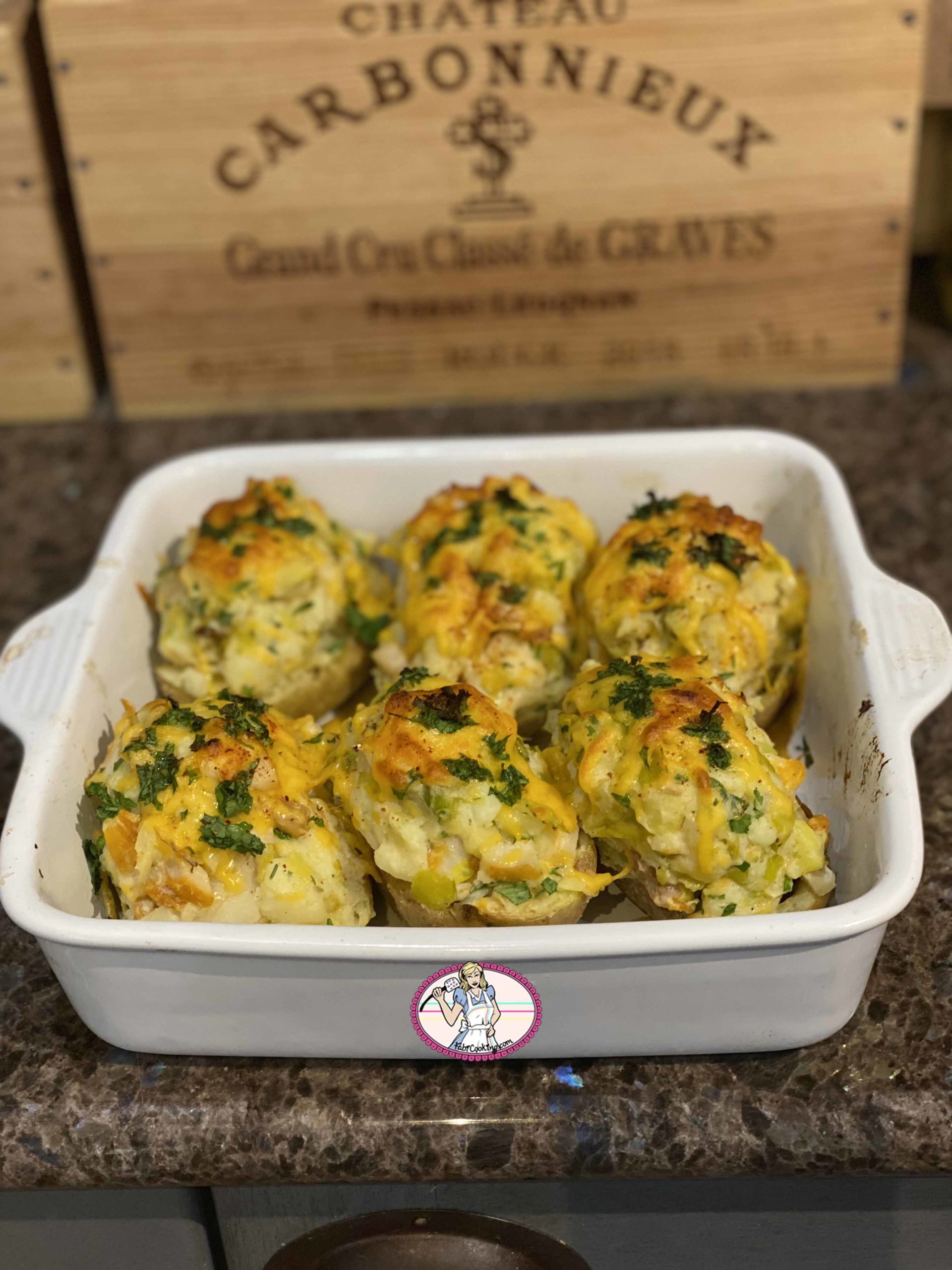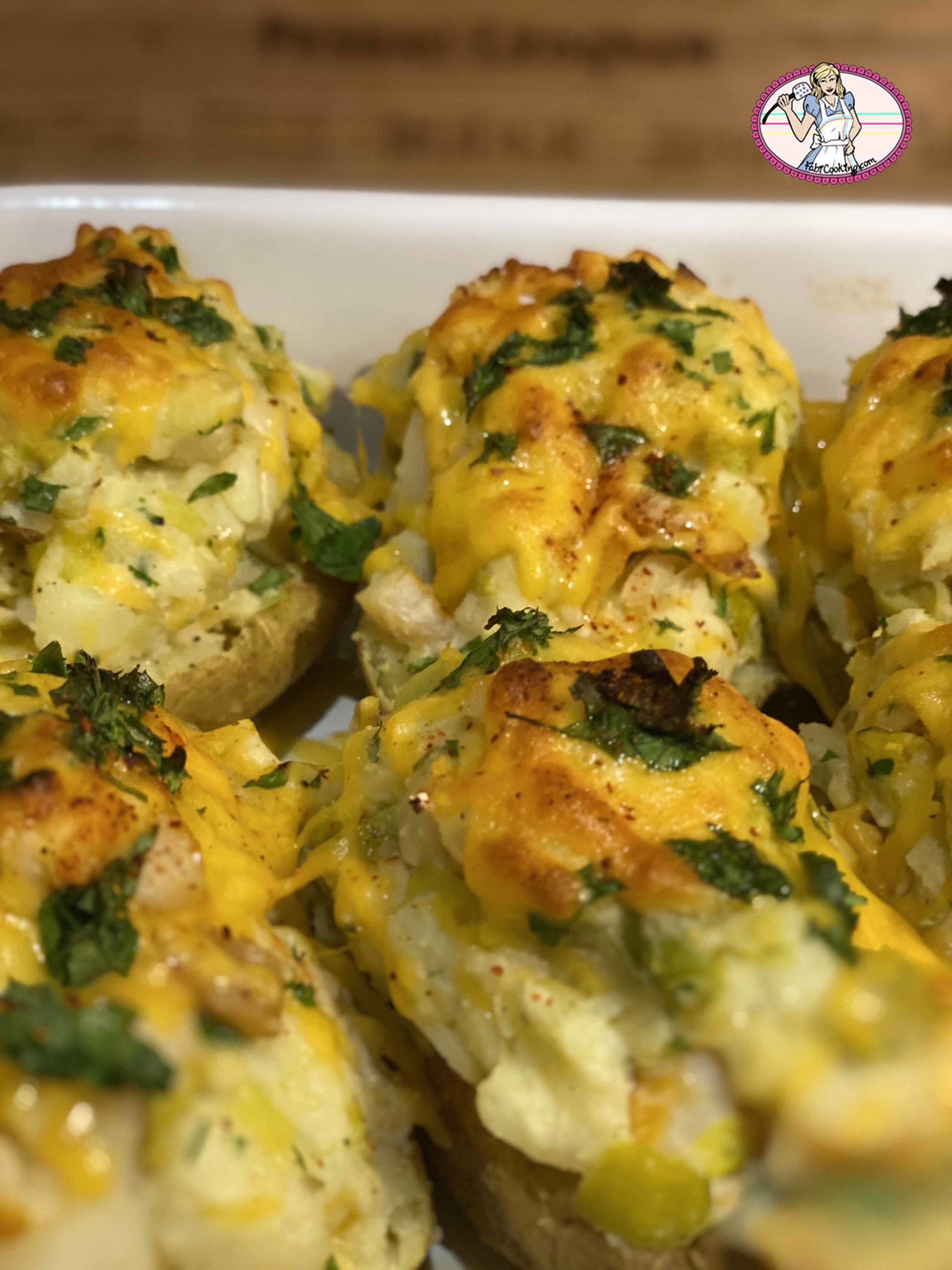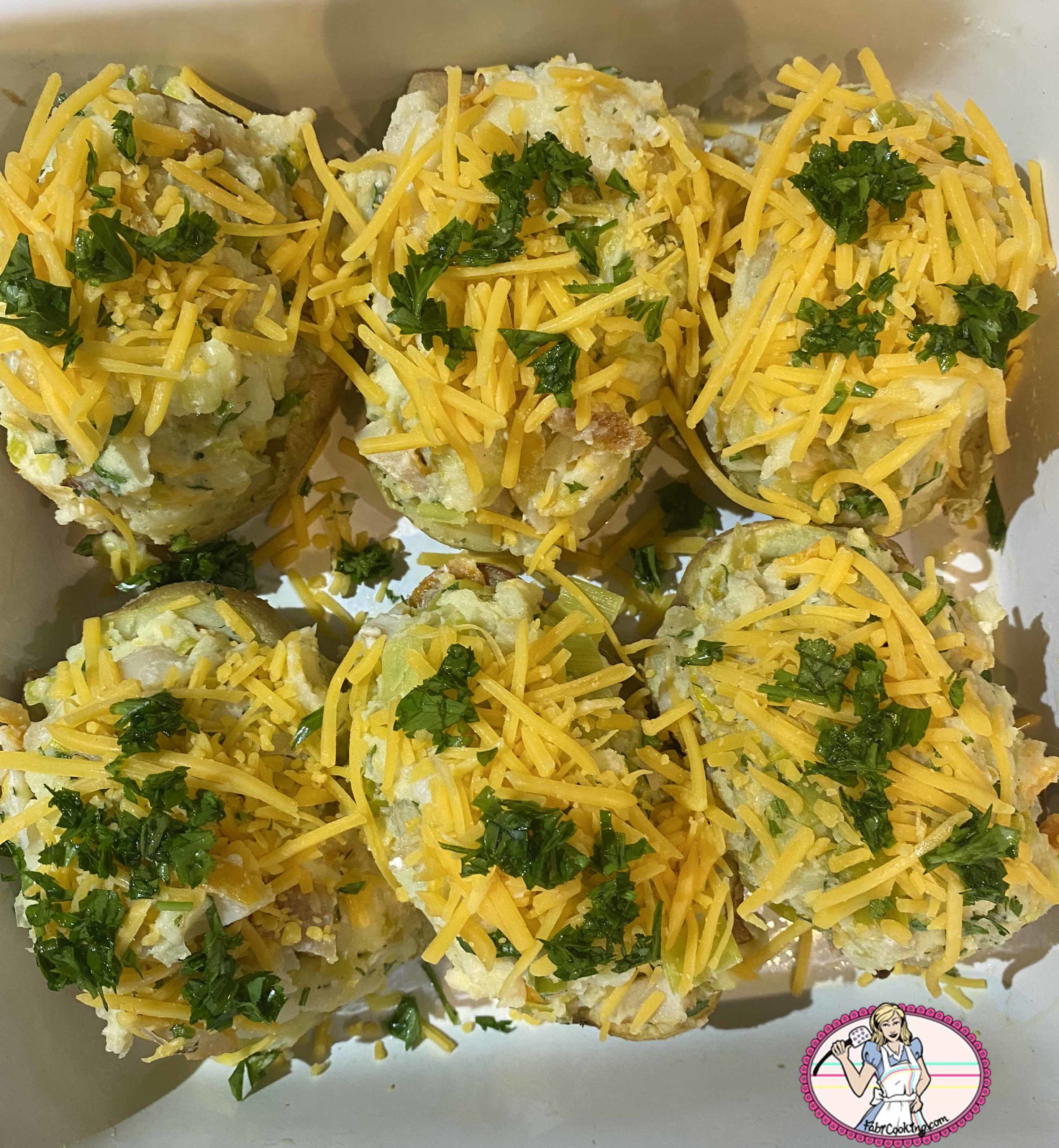 11. Garnir généreusement chaque moitié de pomme de terre. Recouvrir de cheddar râpé et d’un peu de persil. Placer dans un plat allant au four en versant un filet d’huile dans le fond.