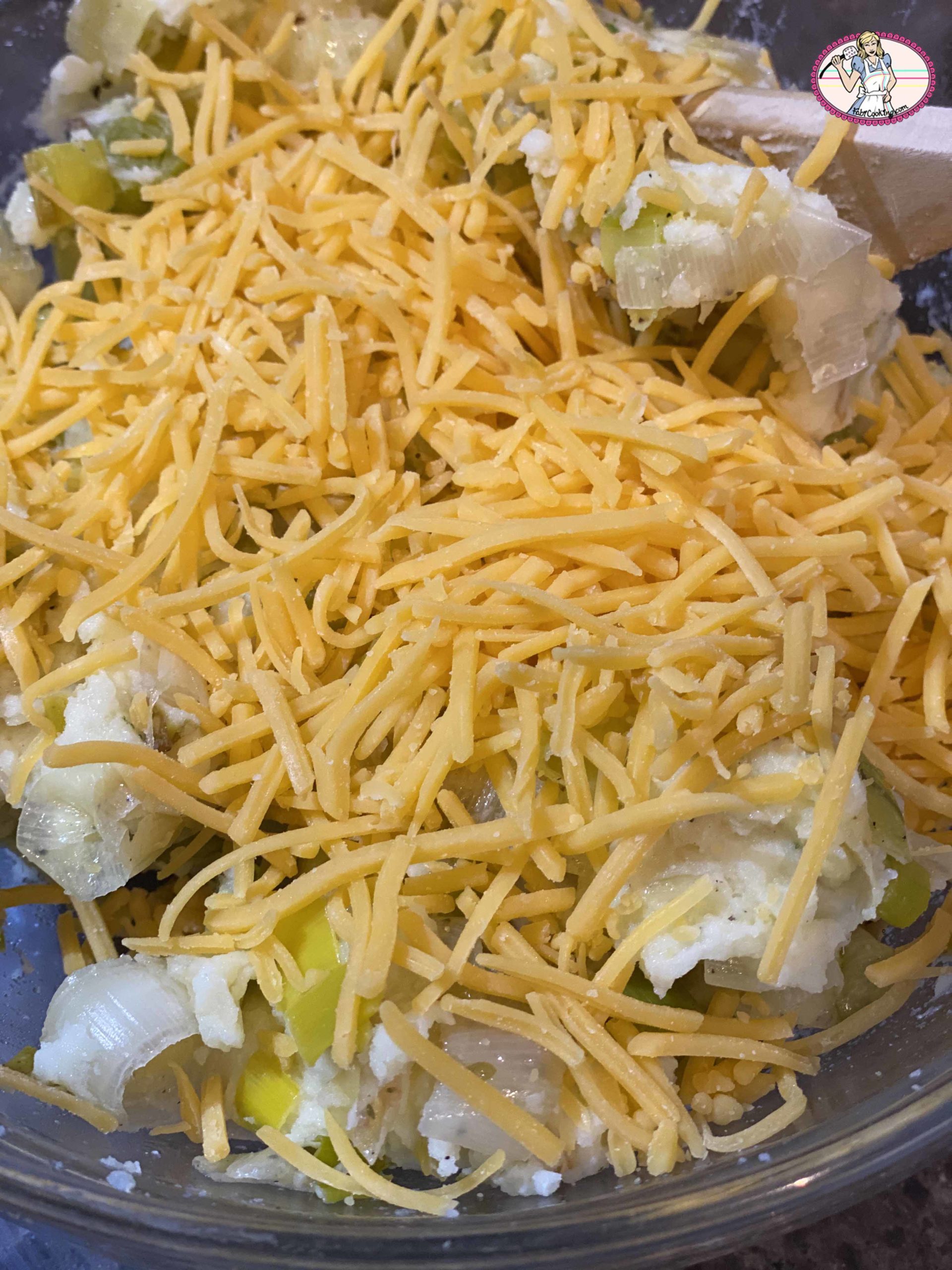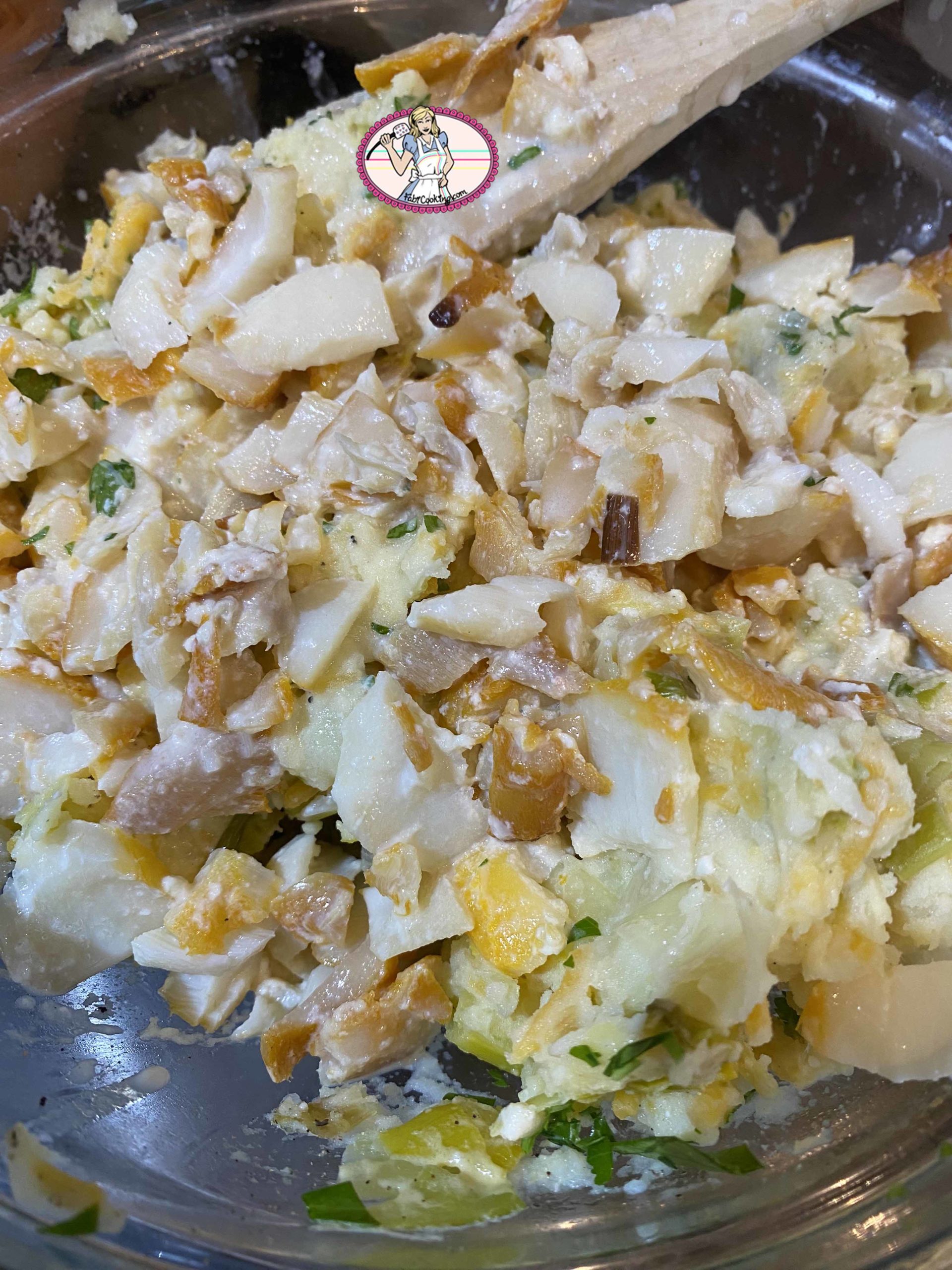 8. Ajouter les poireaux cuisinés, le persil haché dont vous garderez une belle cuiller à soupe pour la fin et la cuiller de moutarde forte de Dijon et mélanger sans écraser.