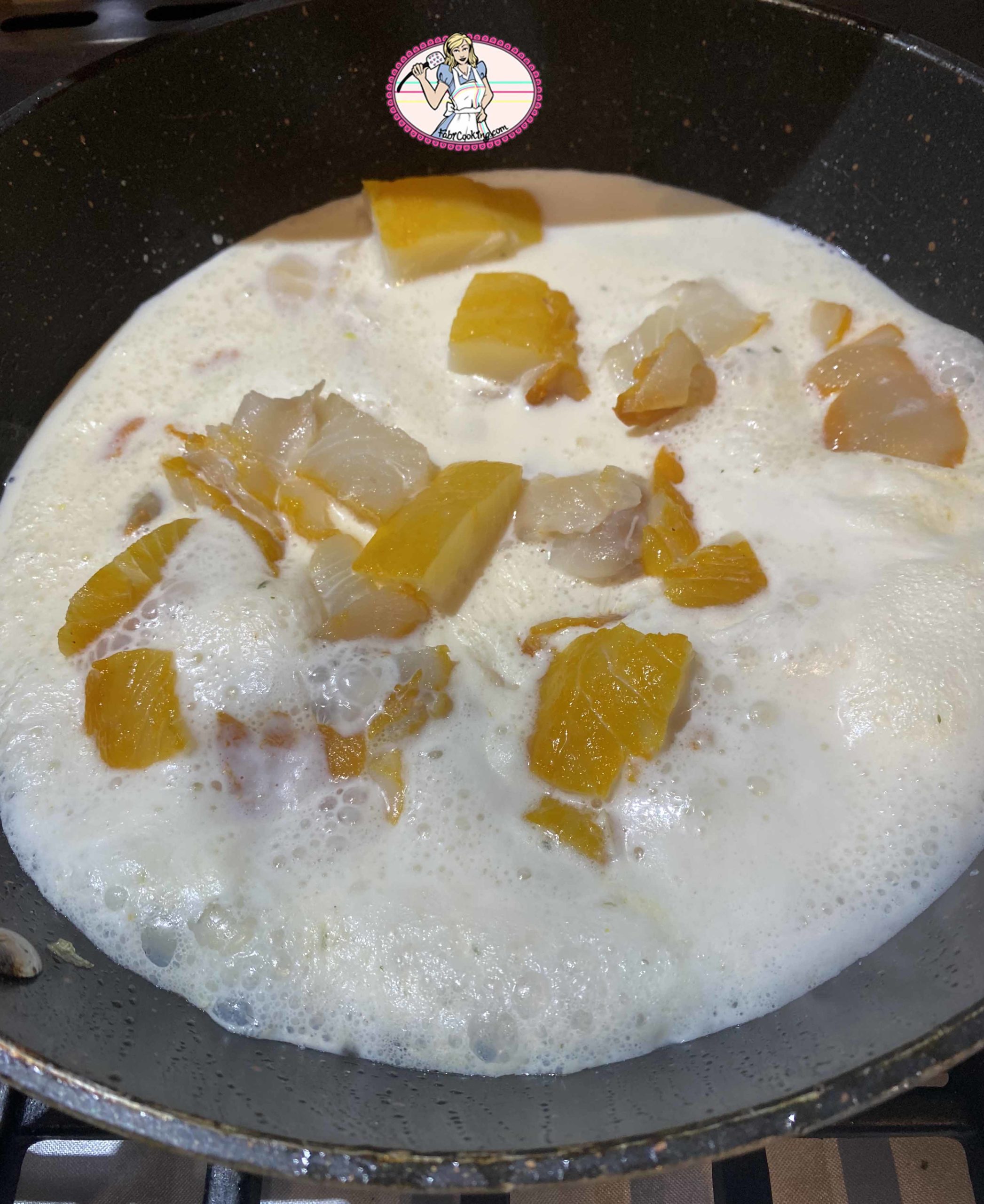5. Dans la même poêle, verser 250 ml de lait entier et les morceaux de haddock. Mener à ébullition, baisser le feu et continuer la cuisson pendant 6 mn en retournant le poisson à mi cuisson. Verser dans un contenant en réservant 10 cuillers à soupe de lait et jeter le reste.