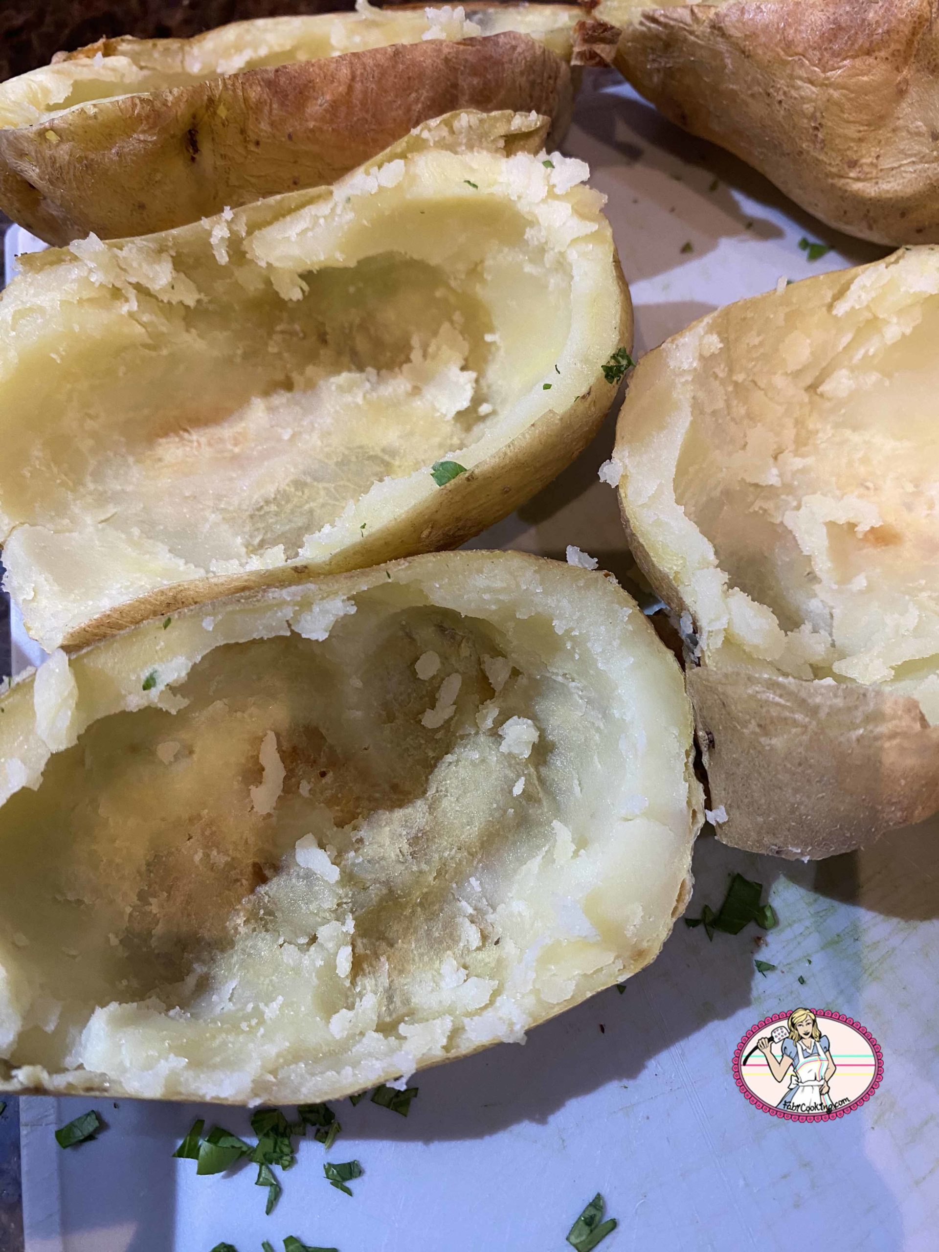 6. Une fois les pommes de tertre cuites, les couper en deux et les vider à l’aide d’une cuiller parisienne en veillant à ne pas se brûler ( porter un gant!) et avec délicatesse pour ne pas en déchirer la peau. Ce n’est pas très joli mais cela fonctionne!
