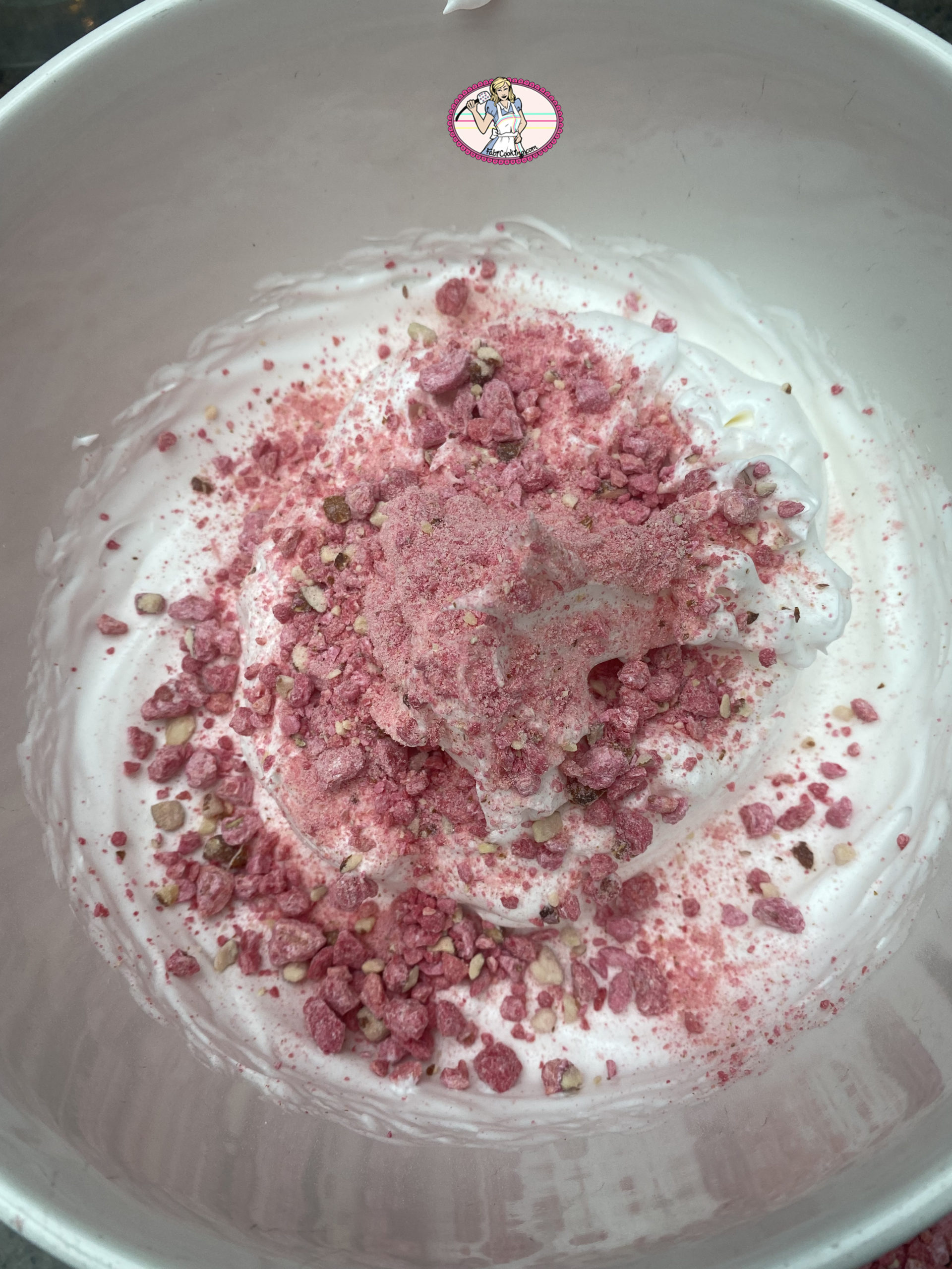 4. Incorporer en deux fois les pralines en réservant les plus gros morceaux pour la déco finale. Les blancs d’œufs vont se colorer légèrement.