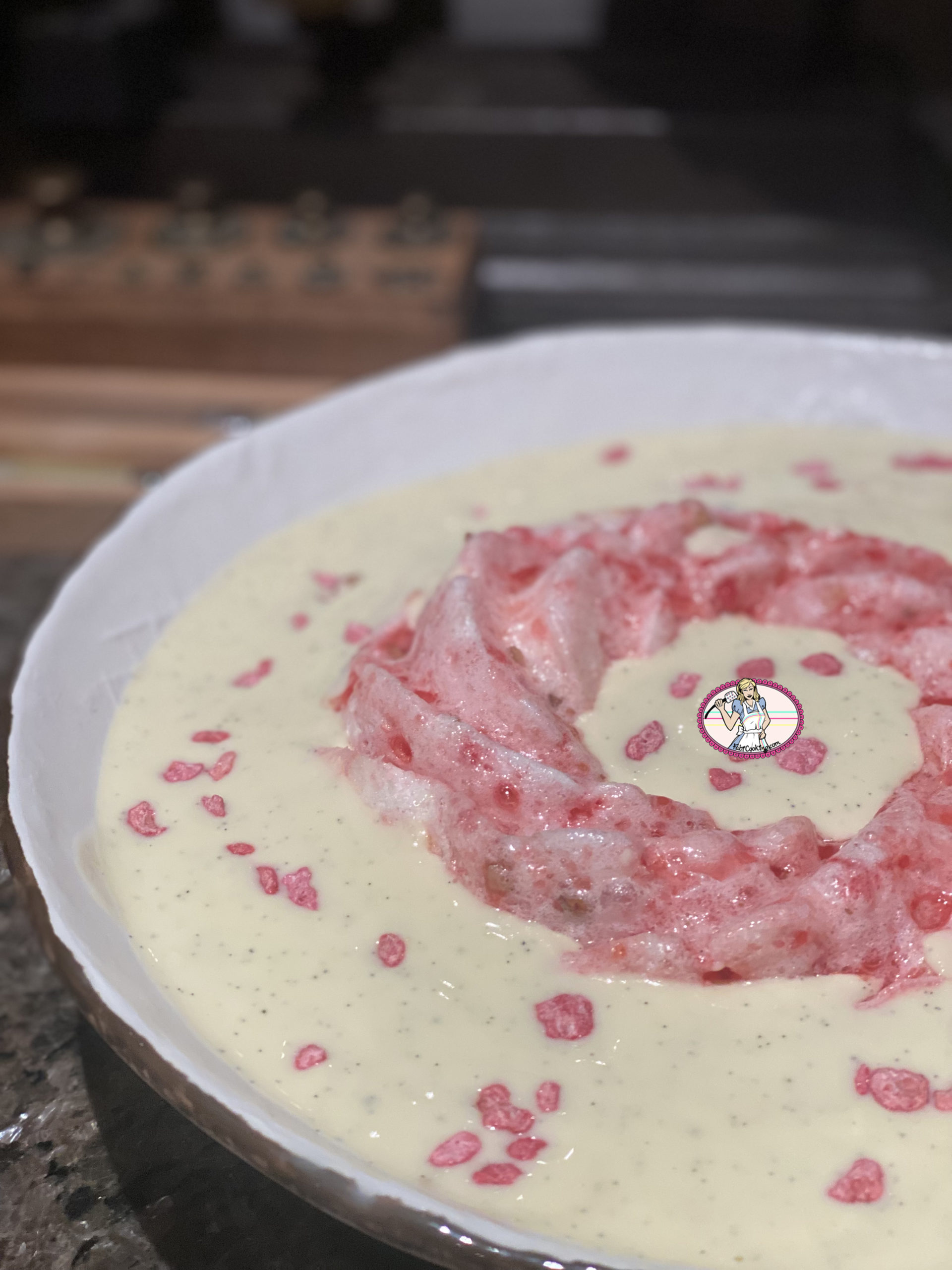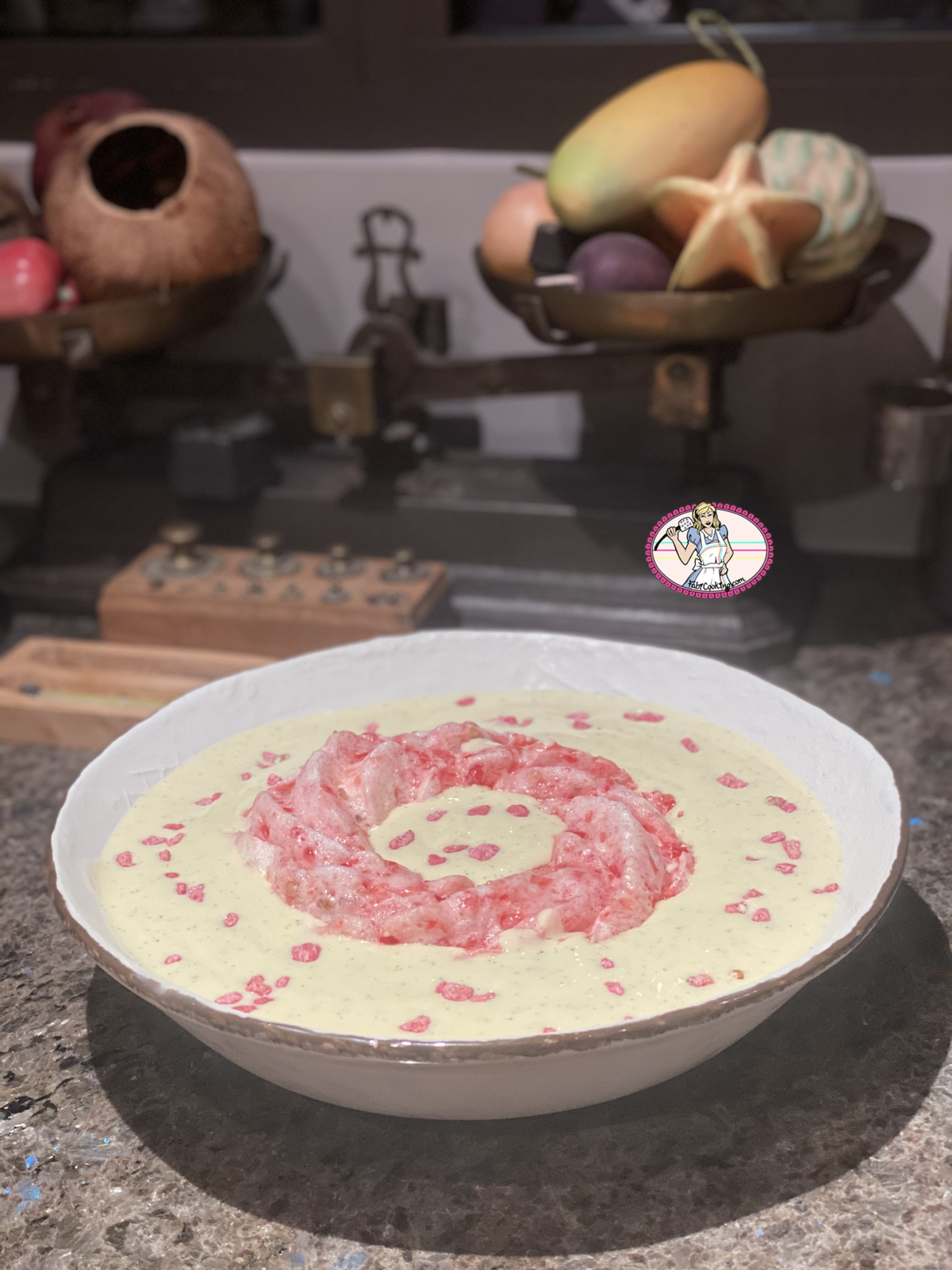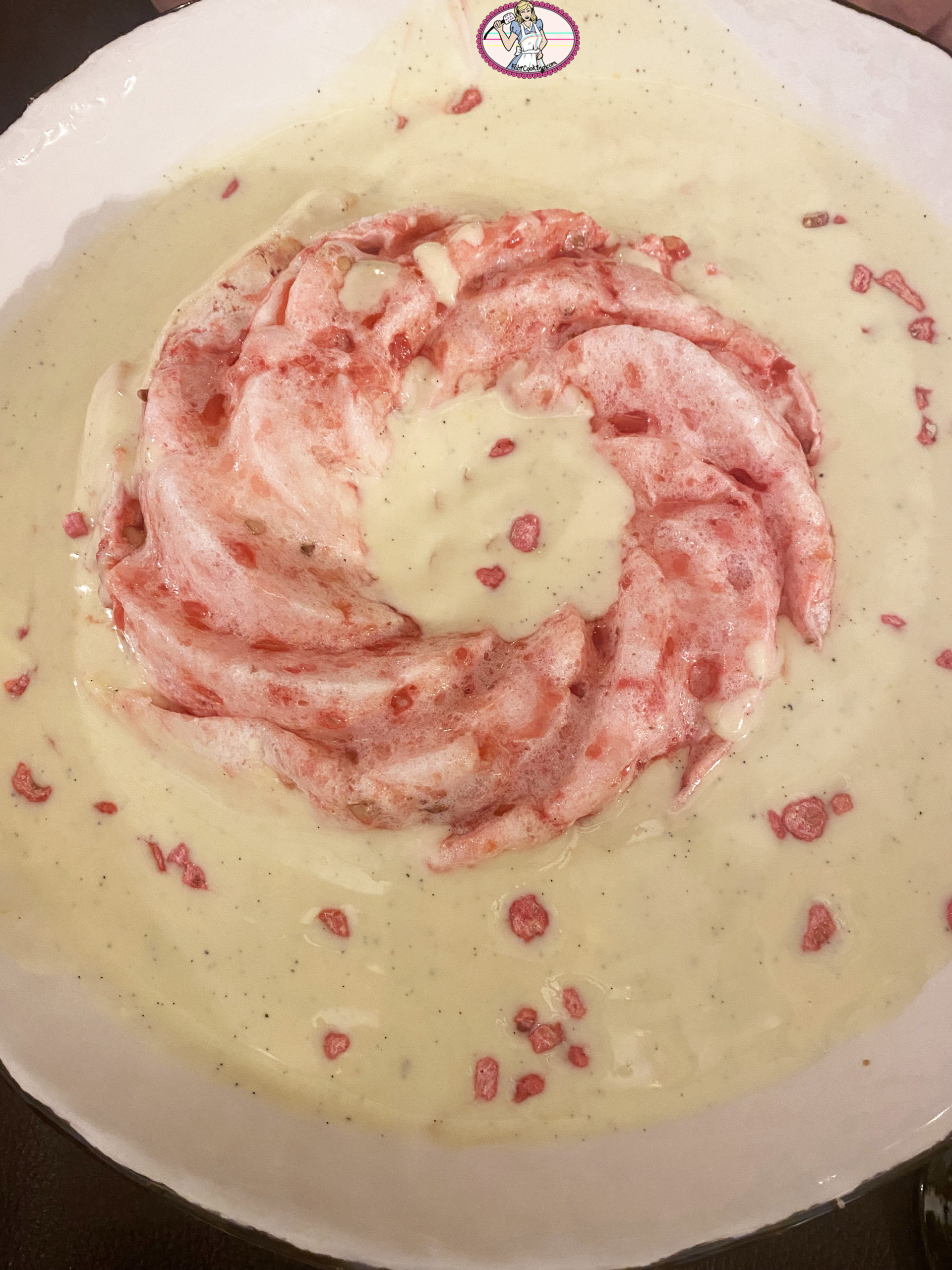 8. Verser la crème anglaise bien froide autour de la l’ Île, décorer d’un peu de pralines concassées et régalez vous!