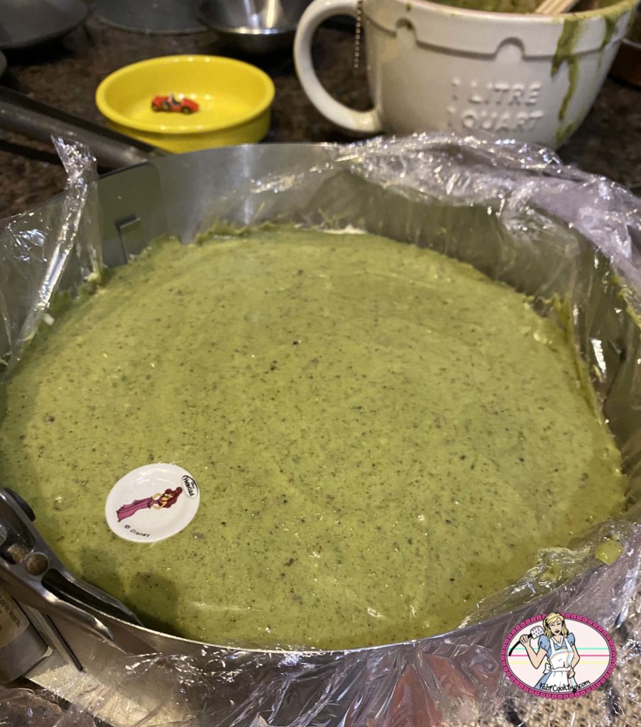 - Dans le cas de notre galette deux en un, je commence par dresser la frangipane amande à l’interieur d’un cercle à mousse ou à pâtisserie, chemisé de film alimentaire, puis je la recouvre de frangipane à la pistache. Je place la fève et congèle le tout pendant 4 heures minimum.