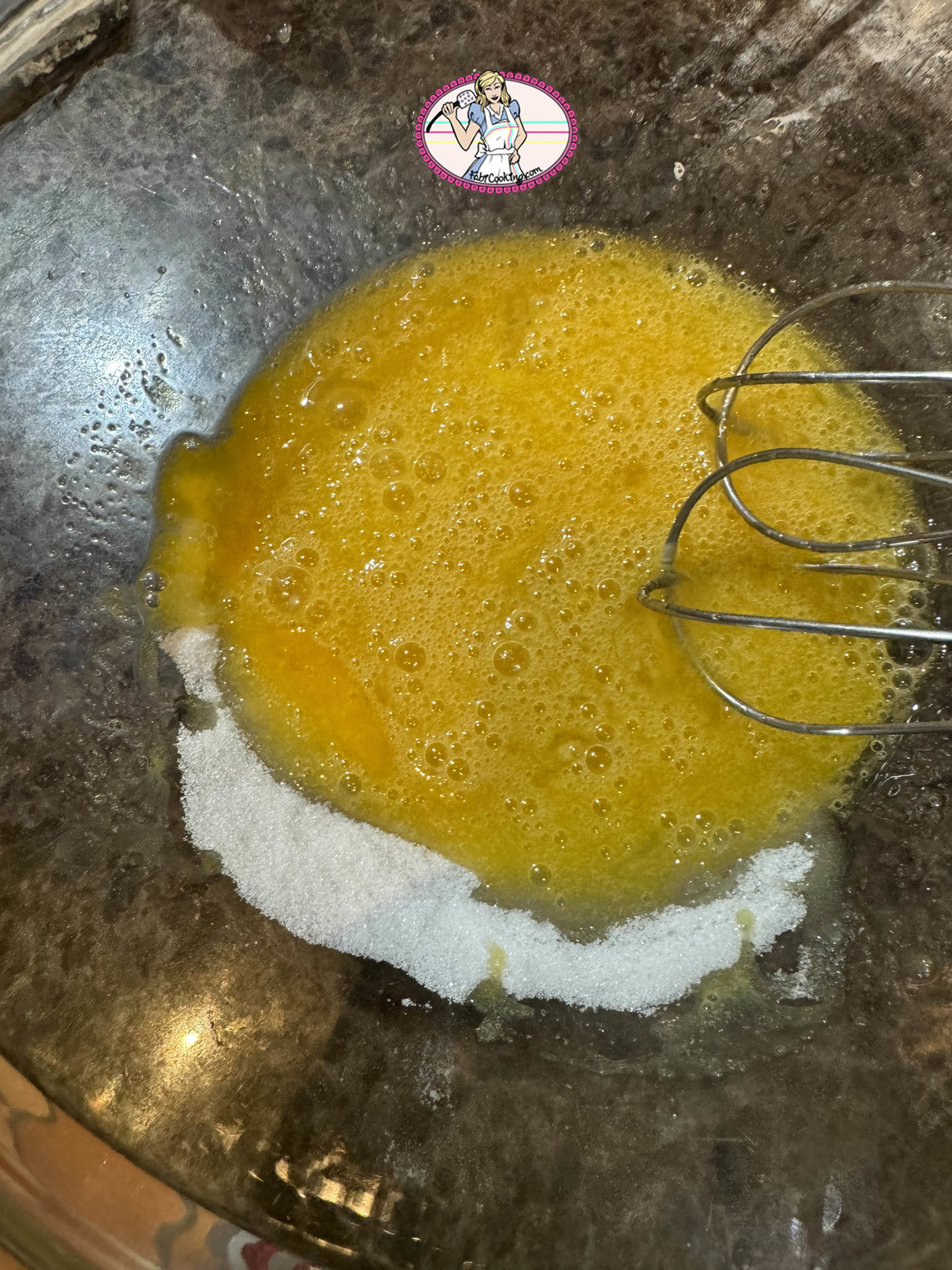 - Dans un cul de poule, fouetter les oeufs et le sucre jusqu’à ce que le mélange blanchisse