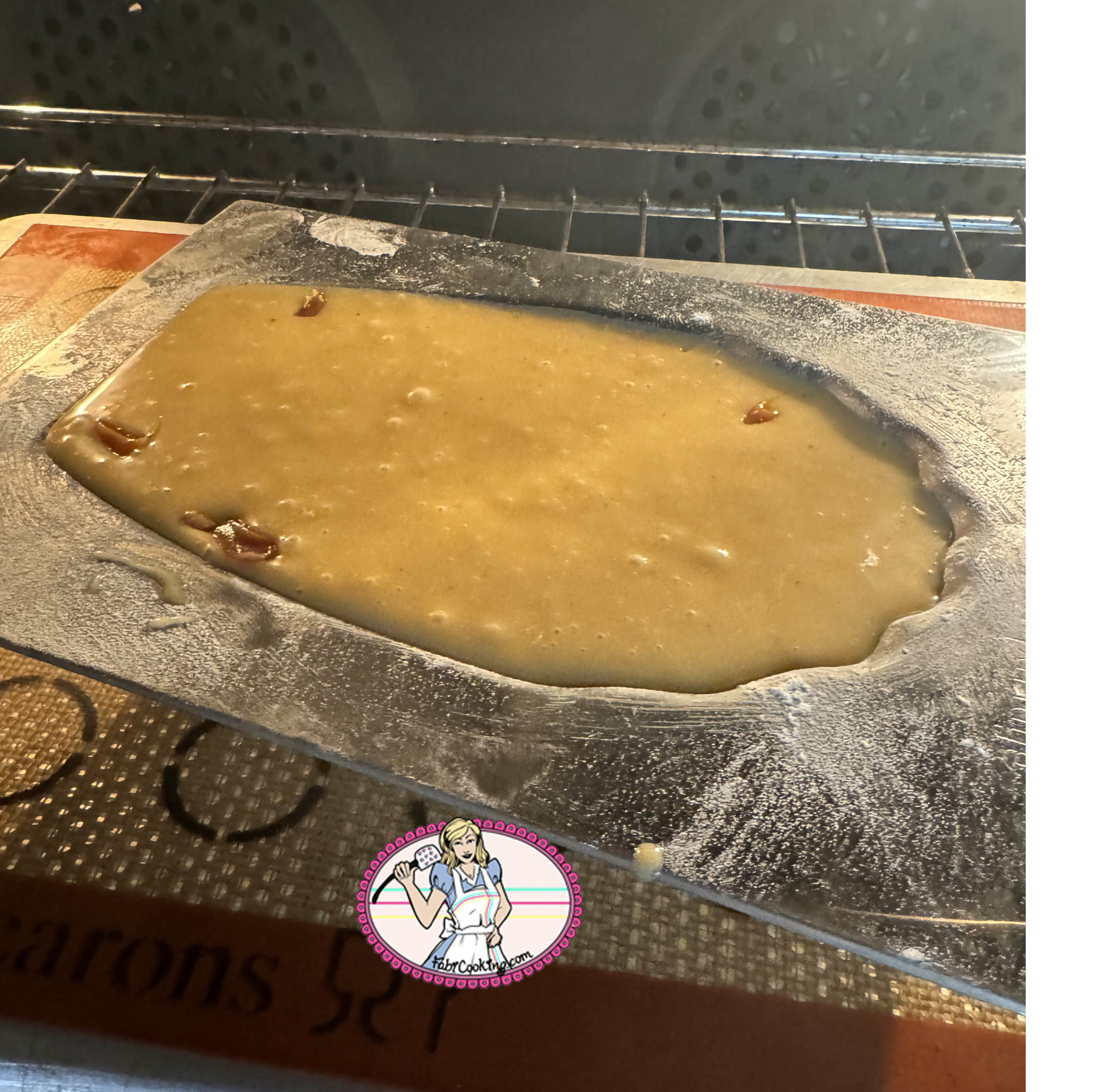 9. Verser le reste en deux fois en plaçant des morceaux de caramel en évitant les bords ( il va fondre et coller). Chez moi, le caramel a bougé entre le frigo et le four!