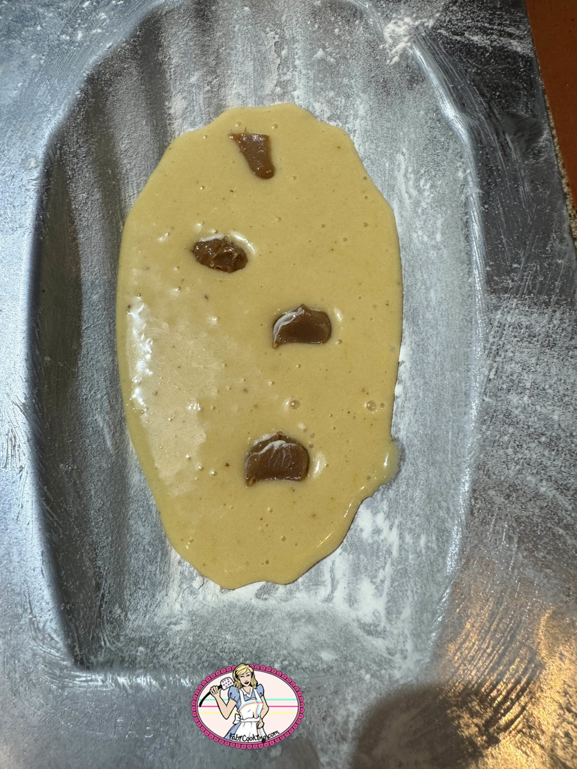8. Verser le tiers de l’appareil dans le moule et découper de petits bouts de caramel