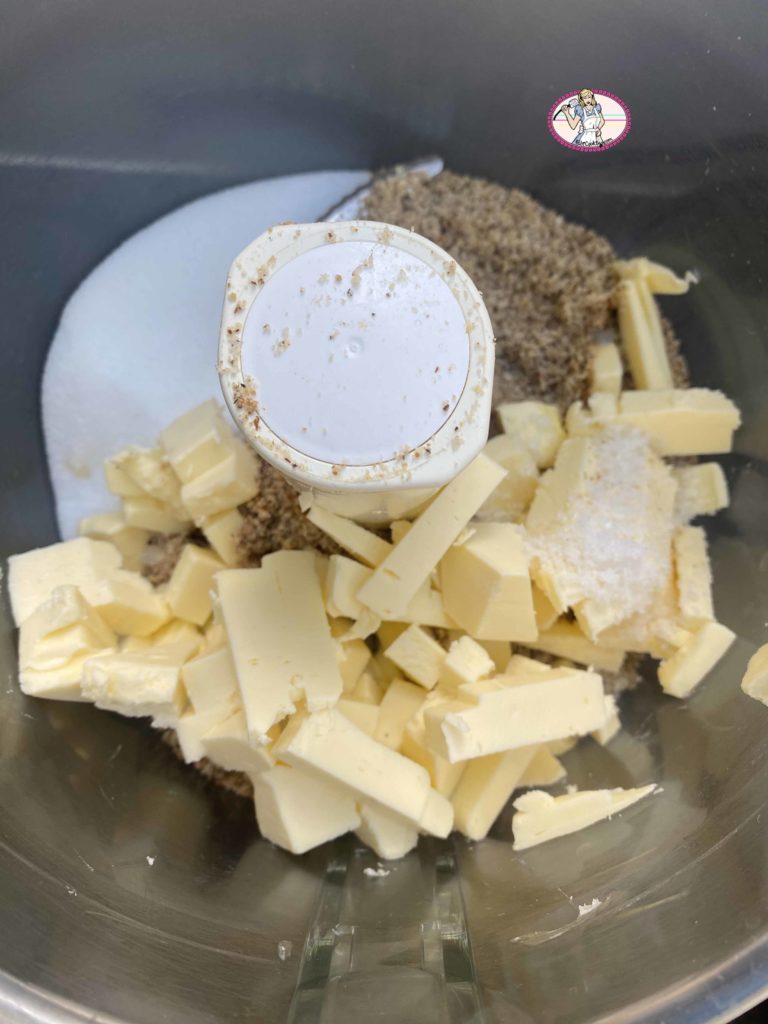 - Quand la poudre de noisette n’est plus chaude, ajouter la farine tamisée, le sel et le sucre dans la cuve du robot.