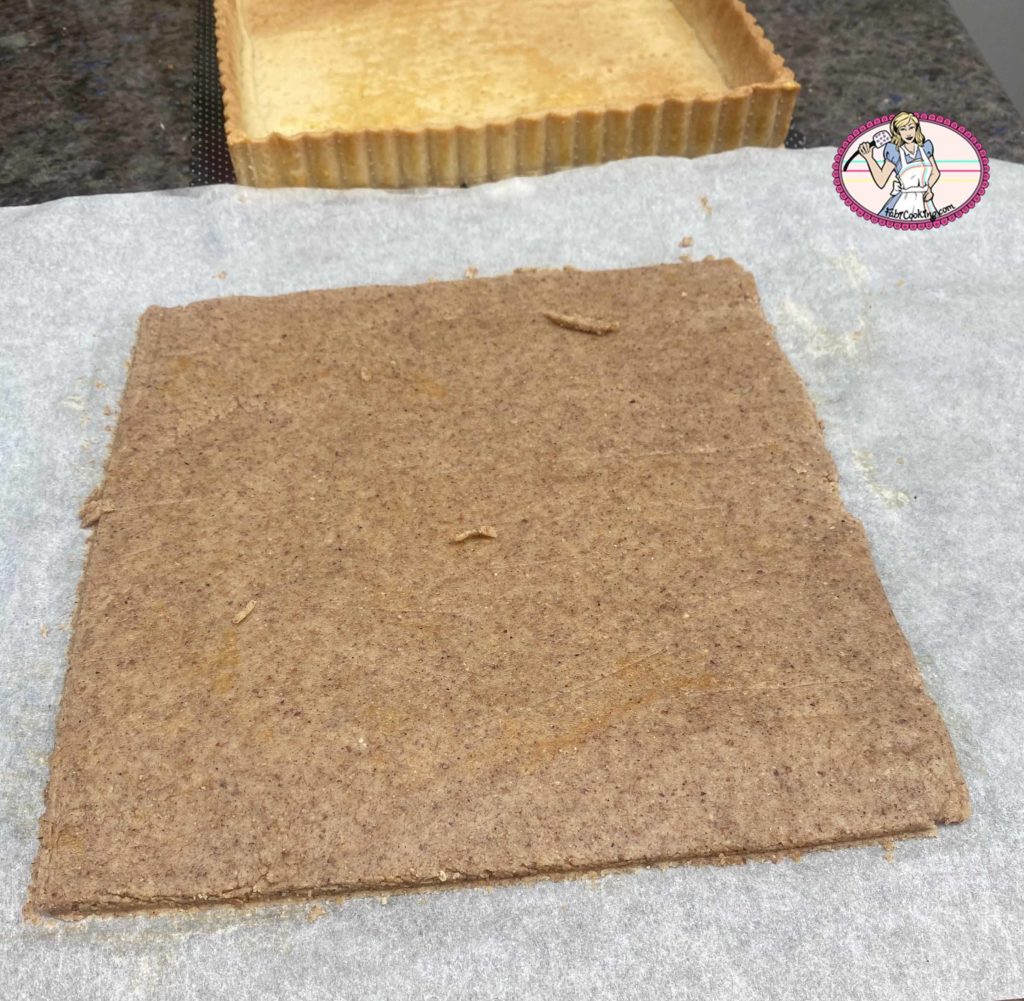 - Etaler cette pâte de noisette entre deux feuilles de papier cuisson et étaler au rouleau sur 4 mm en lui dormant la forme du moule que vous avez choisi. Placer au congélateur.