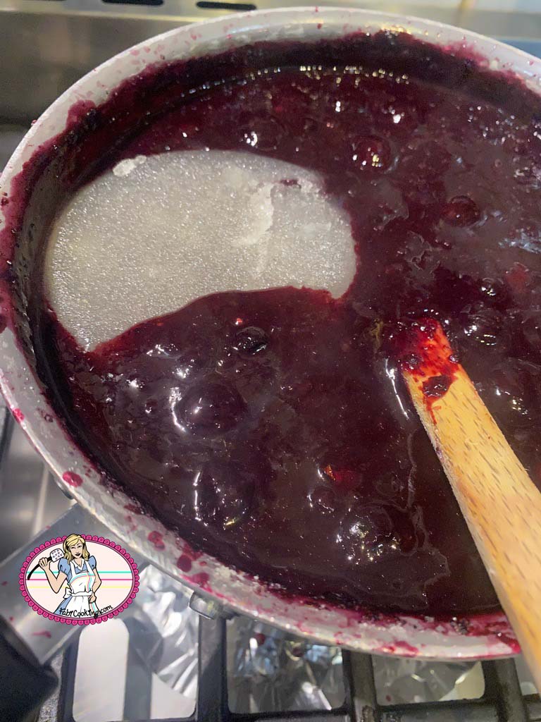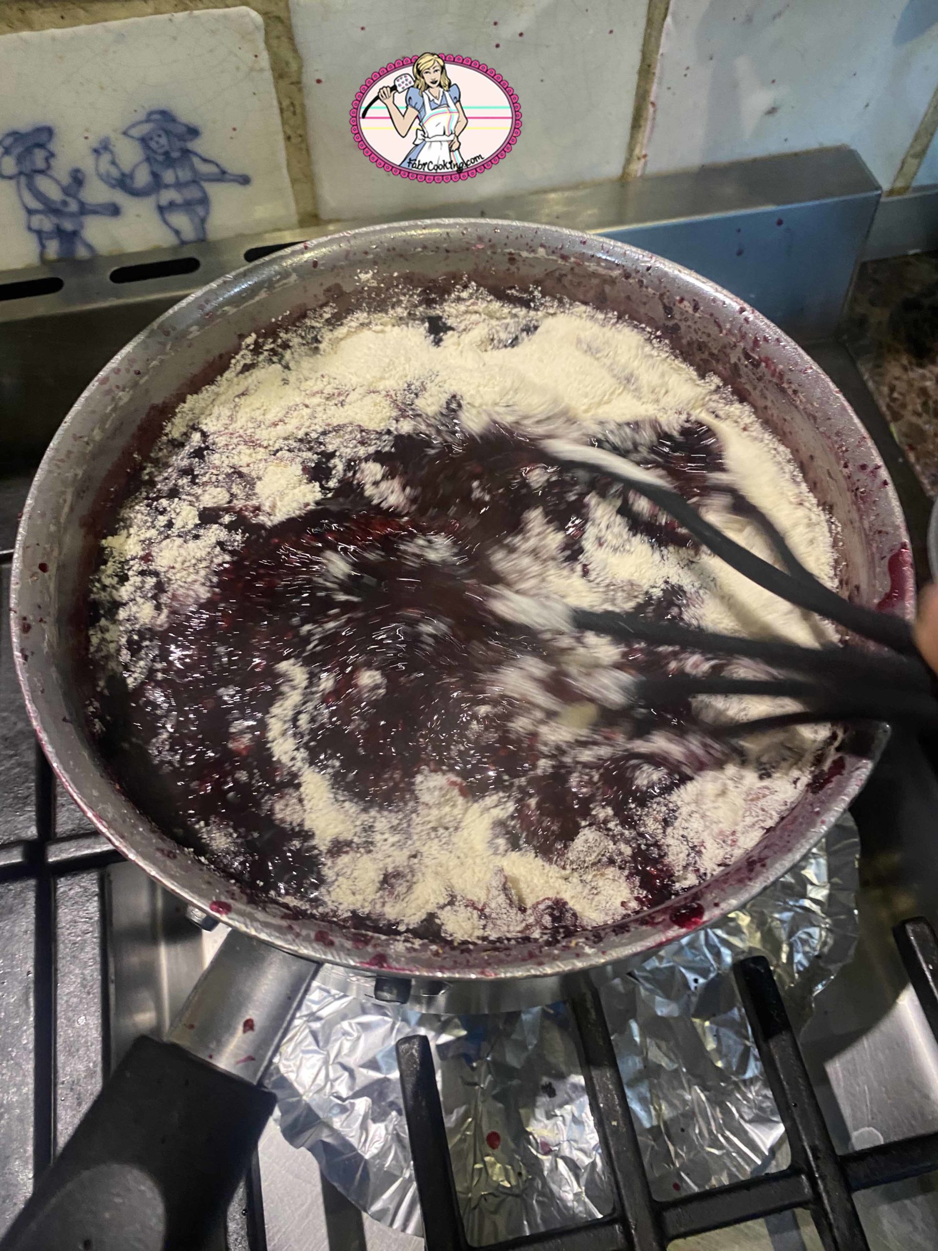 - À ébullition, ajouter le mélange sucre/pectine. Mélanger vigoureusement et continuer la cuisson 1 à 2 min supplémentaires.