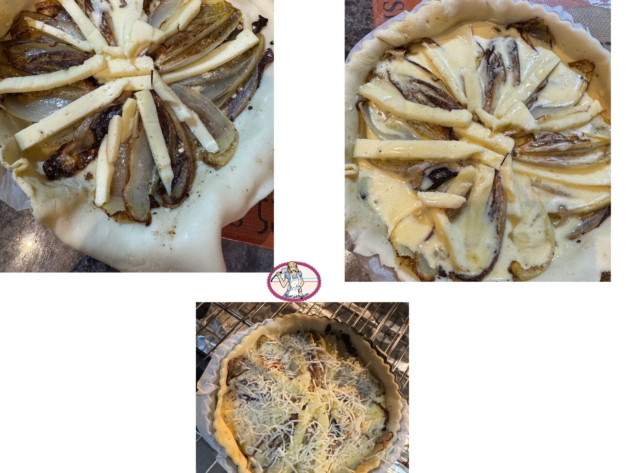 - Beurrer un moule à tarte de 18 cm, chemiser le fond avec du papier cuisson. Bien faire adhérer la pâte sur les bords, piquer le fond avec une fourchette et placer les endives en croix.