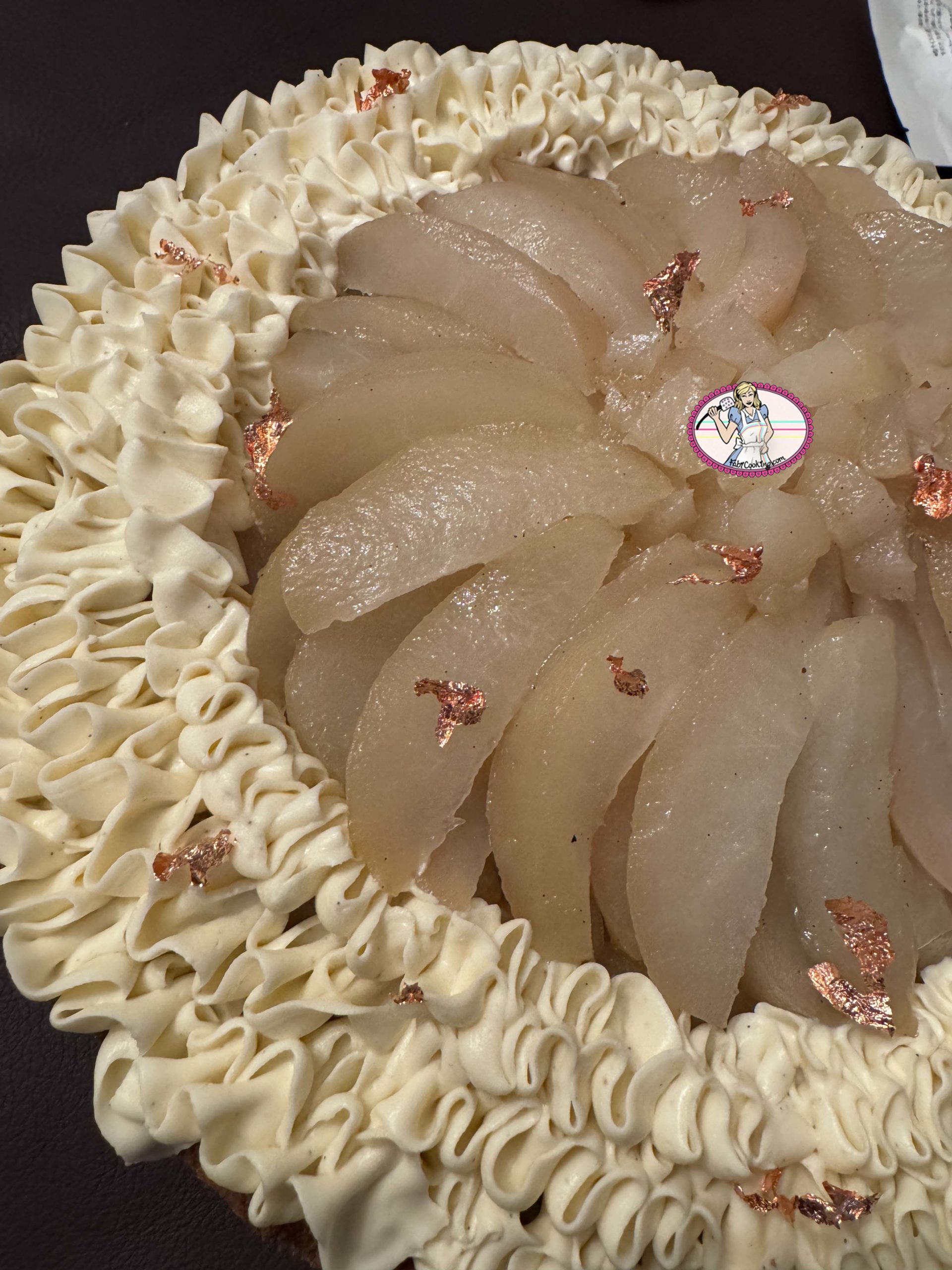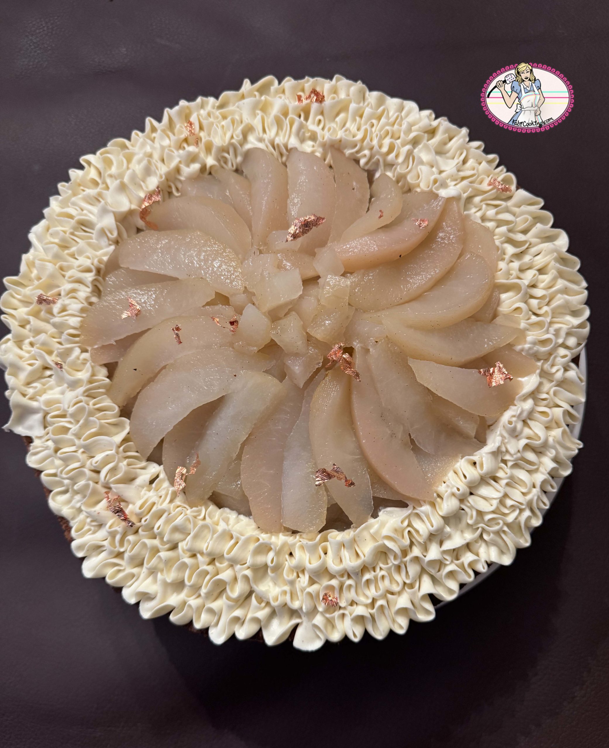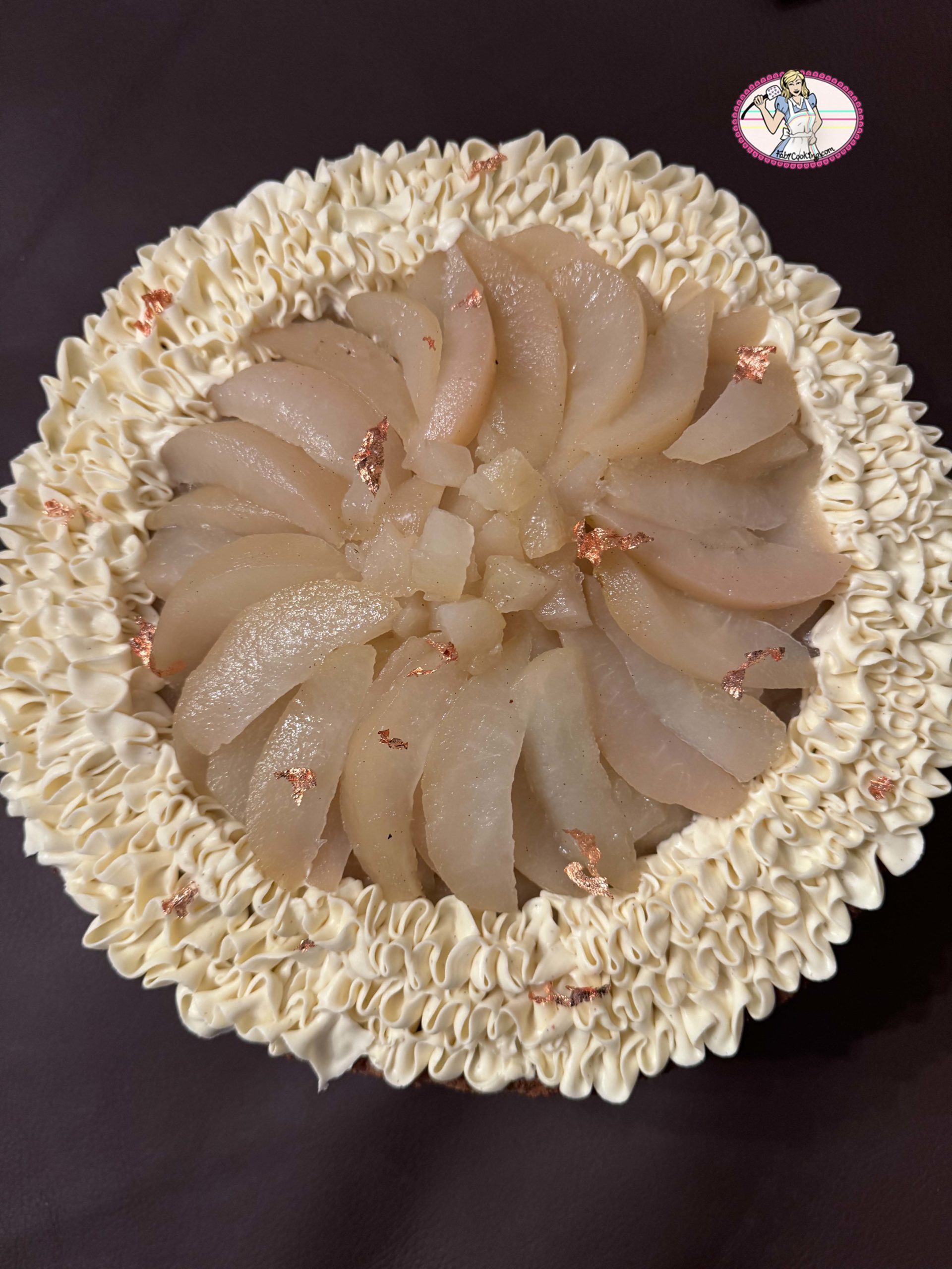 Ma recette du jour, la poire et son sablé breton est toute simple comme son nom l’indique. Elle se compose d’un sablé breton donc, de poires pochées ,dans un sirop léger parfumé, qui sont délicatement posées sur une compote de poires à la cardamome. Une jolie ganache fouettée au chocolat blanc et à la cardamome l’habille avec ses petits frous frous.