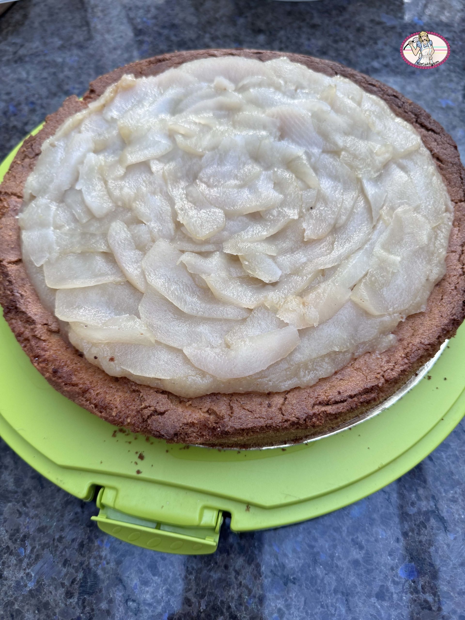- Couper une des poires en fines tranches et en recouvrir la compote.