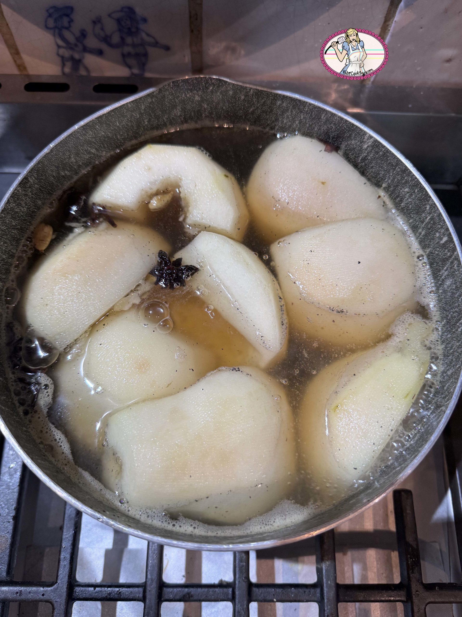 6. Délicatement, plongez les poires dans le sirop chaud. Assurez-vous qu’elles sont complètement submergées….. ou presque.