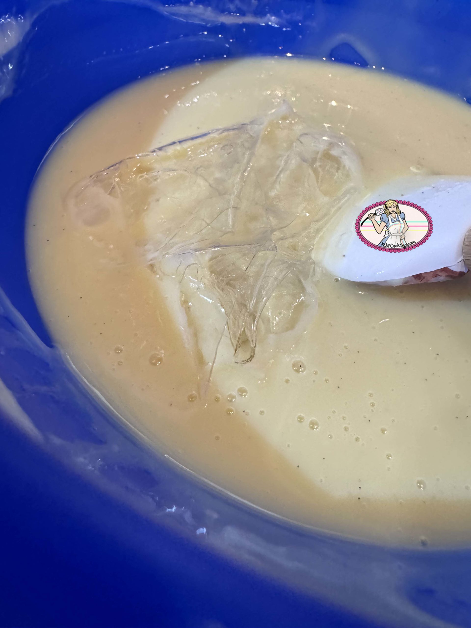 - Remettre la crème sur feu doux et ajouter la feuille de gélatine ramollie. Bien remuer pour faire fondre la gélatine.