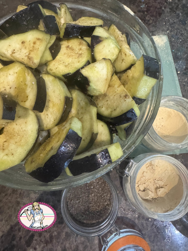- Dans un saladier, placer la moitié des aubergines, verser 2 cuillers à soupe d’huile d’olive, saler, poivrer, ajouter 1 cuiller à café d’ail en poudre et une autre d’oignon. Mélanger puis rajouter le restant des aubergines, de poudre d’ail et d’oignon avec une cuiller à soupe d’huile supplémentaire.