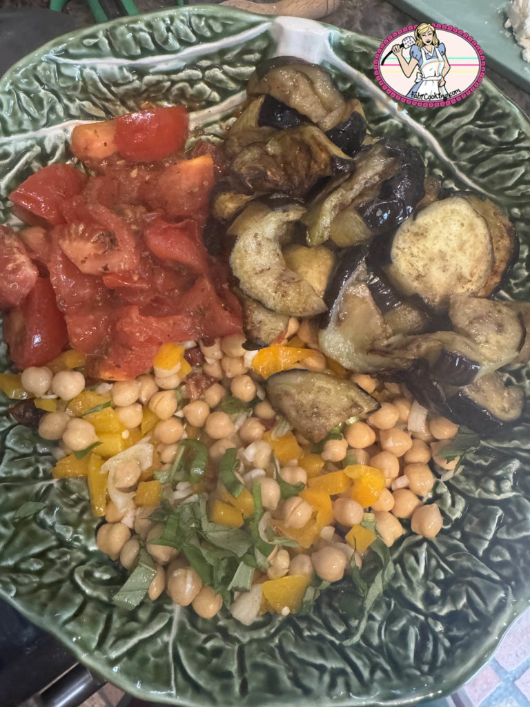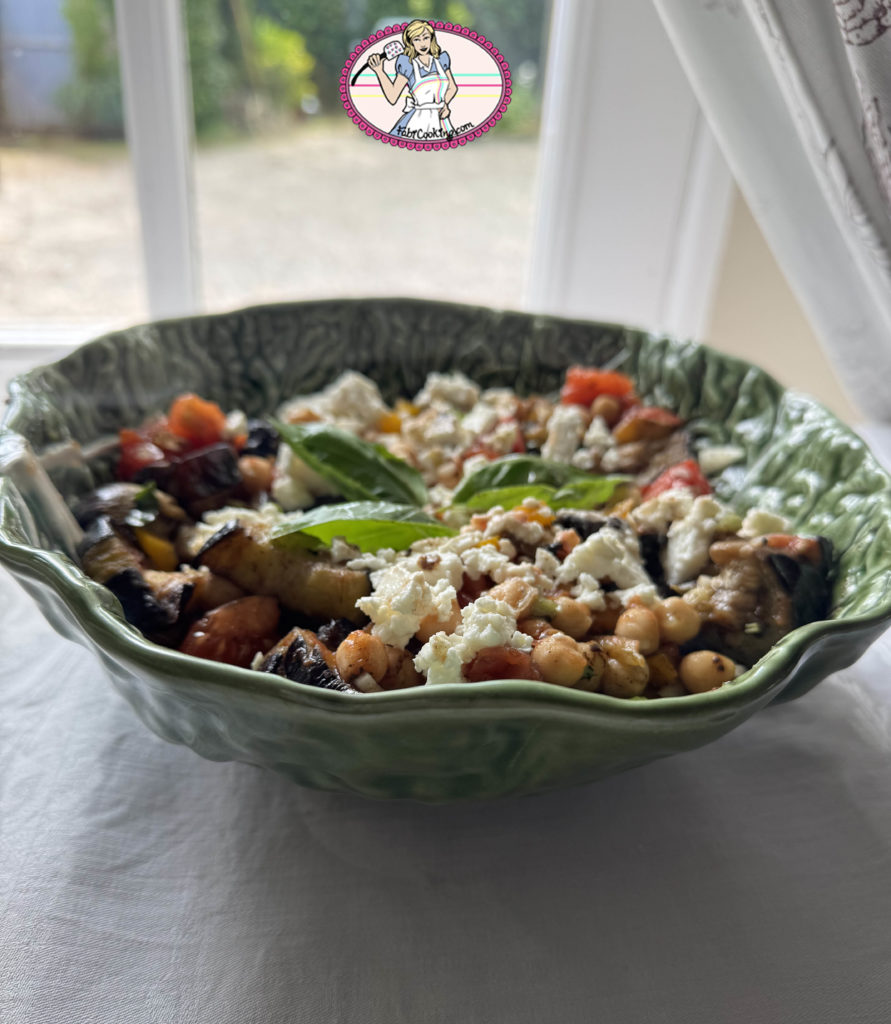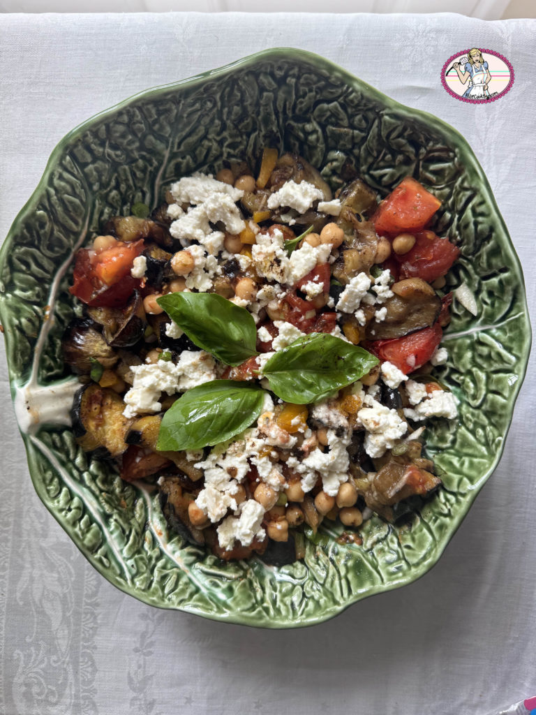 Je ne sais pas vous, mais moi, le soleil me donne envie de salade! Bon, plus qu’à ouvrir le frigo et qu’est ce que j’y trouve ? Deux aubergines, les restant d’une boite de pois chiches ( très rare, car généralement je les laisse tremper et les cuis le lendemain), quelques tomates ( pas cerises malheureusement), un peu de feta et des poivrons.