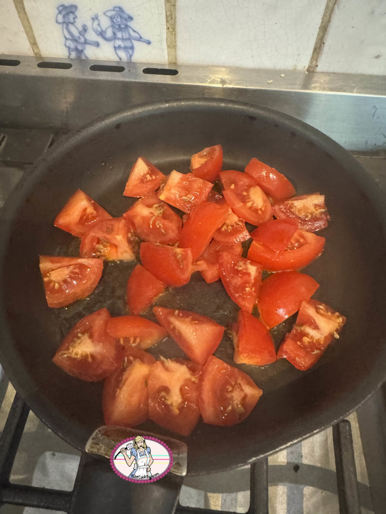 - Dans une poêle, verser 1 cuiller à soupe d’huile d’olive puis placer les tomates cerises ou les tomates coupées en 4 ou 8 et les laisser confire 4 petites minutes. Saler.