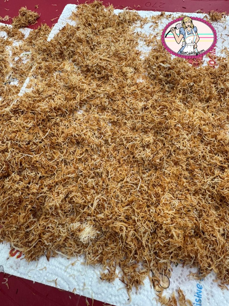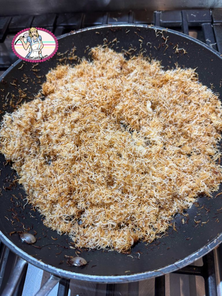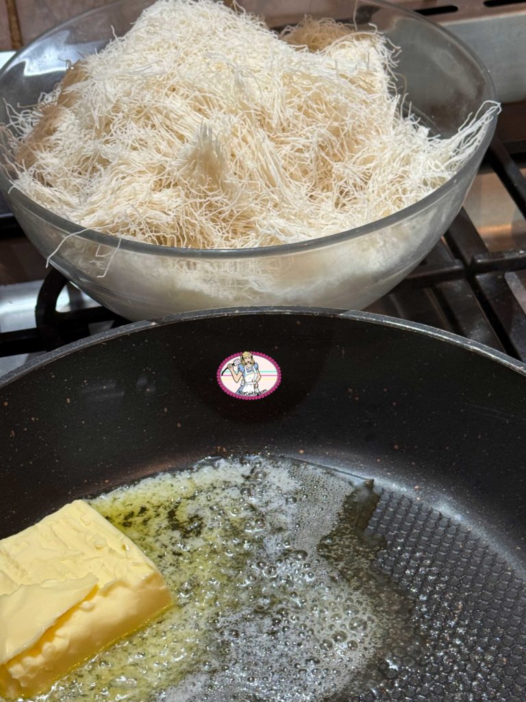 - Étaler une fine couche régulière de kadaïef sur une plaque, enfourner à 170°C jusqu’à ce qu’ils soient bien dorés et croustillants (environ 10 minutes) ou les dorer à la poêle comme moi.