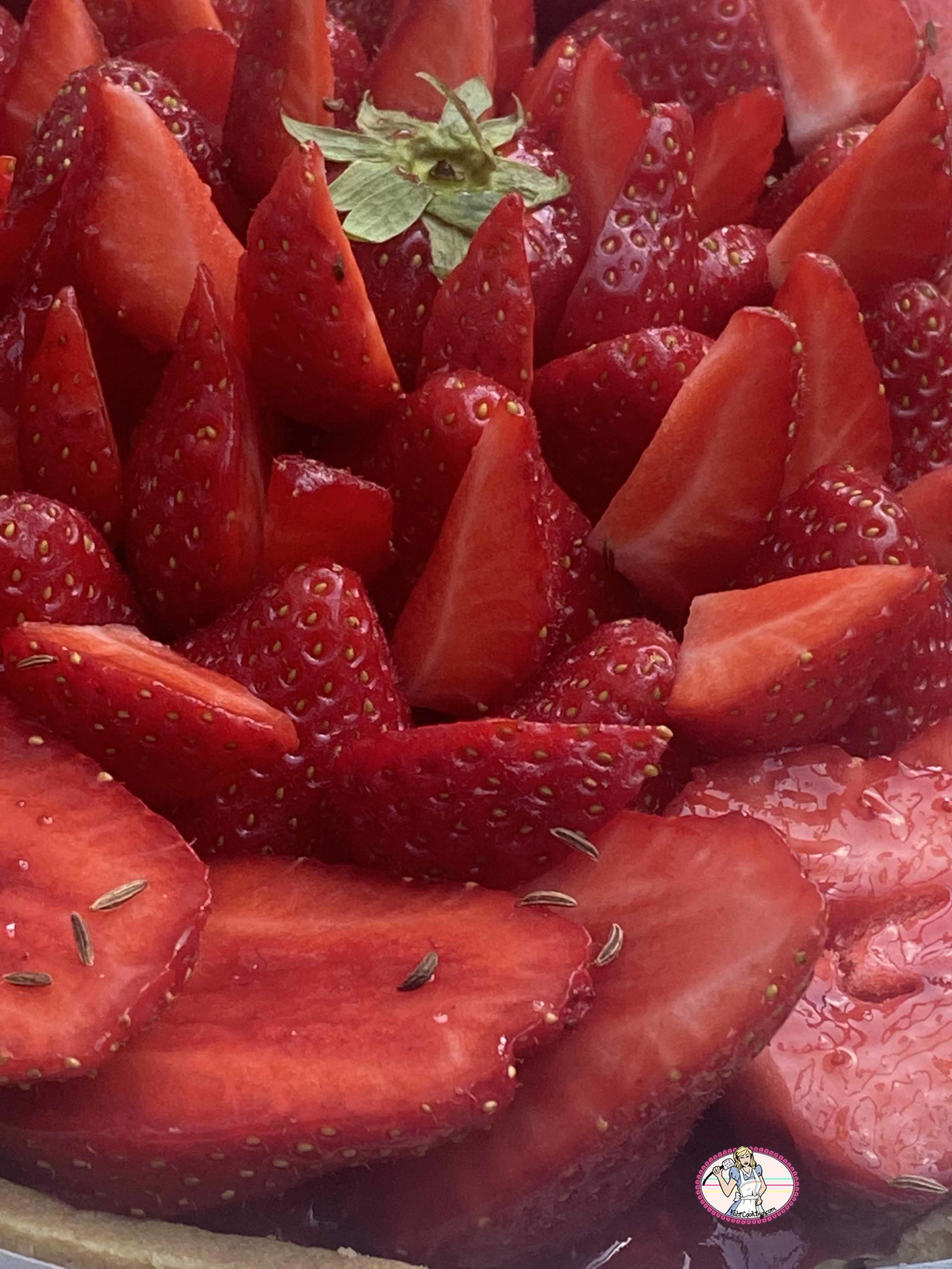 - Rincer les fraises et les découper en 4 et en 2. Garnir la tarte et ajouter quelques graines de carvi puis….qui va se régaler??