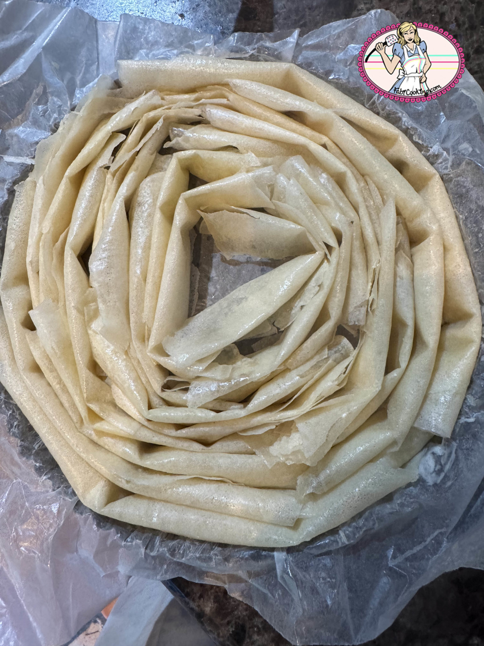 - Badigeonner recto et verso la première feuille avec un pinceau trempé dans le beurre. La rouler sans trop serrer et la placer dans le moule à tarte. Si vous utilisez une pâte filo et comme les feuilles sont plus grandes que celles de brick, couper la feuille en deux avant de l’enrouler pour qu’il y ait moins d’épaisseur et que la cuisson soit bien repartie entre le dessus et le dessous des feuilles.