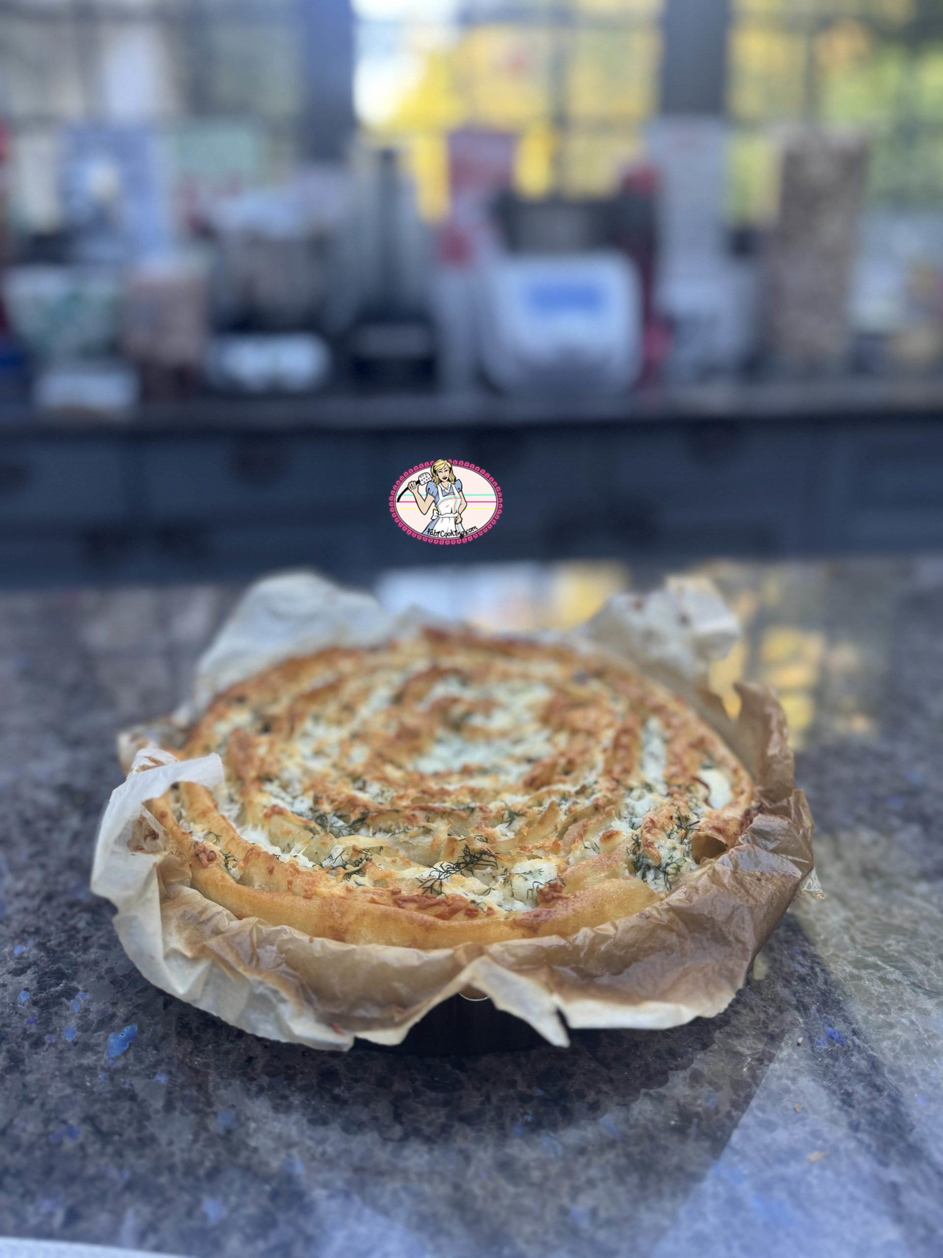 8. Garnir le tourbillon halloumi et aneth en essayant de combler les espaces entre les petits boudins de pâte au maximum. On ne panique pas, comme les feuilles sont déjà un peu cuites, elles ne vont pas ramollir. Terminer par la dernière poignée de halloumi râpé pour le dessus.
