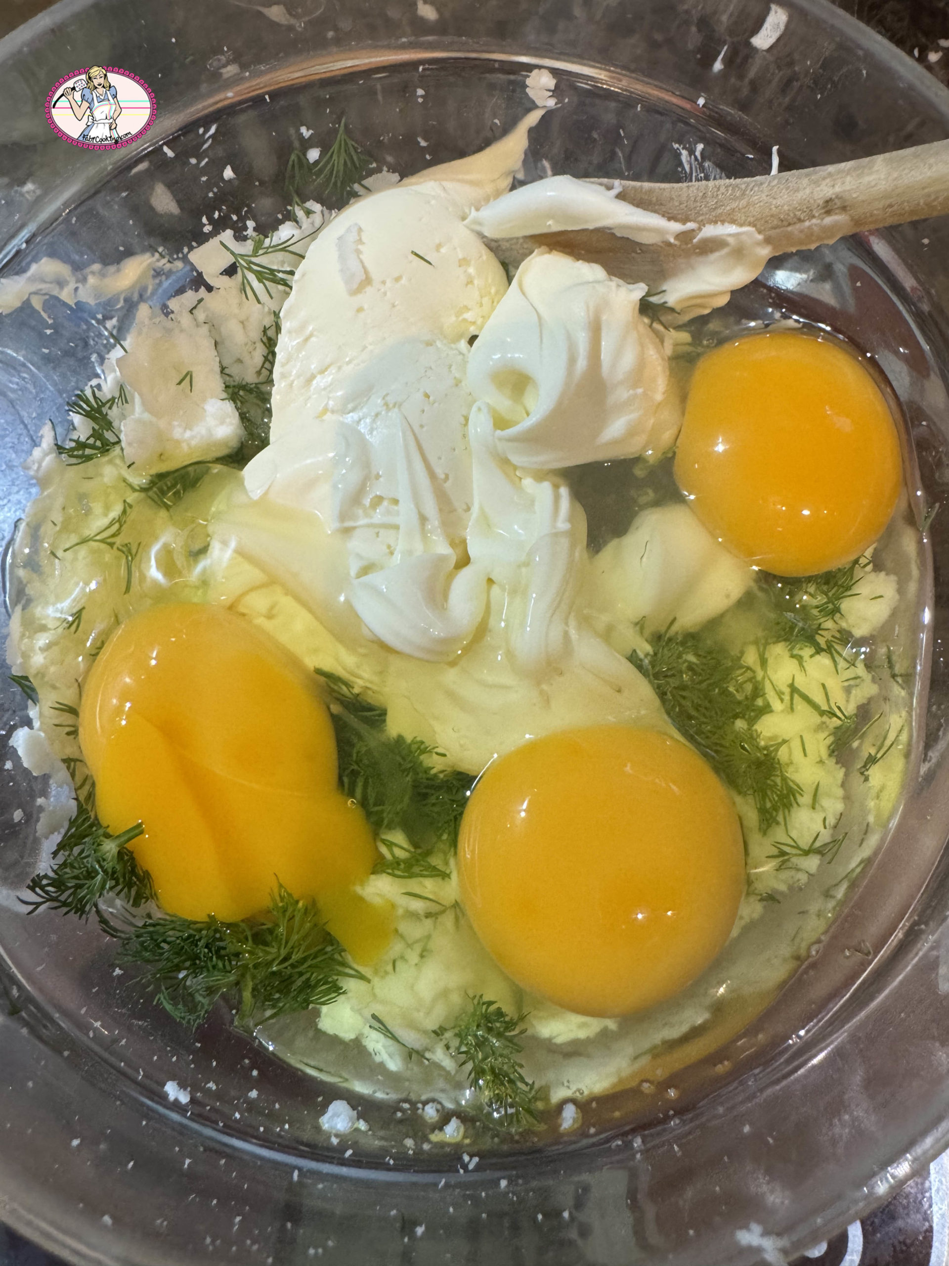 6. Préparer l’appareil à tarte: dans un saladier, râper le halloumi sur les gros trous d’une râpe et en réserver une petite poignée pour le dessus du tourbillon une fois la tarte garnie. Casser les oeufs, ajouter la crème fraîche épaisse, ciseler l’aneth ( soyez généreux, ce mariage est parfait), sans oublier les épices et l’origan. Attention, ne pas saler si vous n’avez pas laisser tremper votre halloumi deux bonnes heures auparavant ou même une nuit. Moi, j’ai complètement oublié de le faire alors que le halloumi n’est pas une découverte pour moi puisqu’il est très utilisé au Liban aussi. Mélanger le tout.