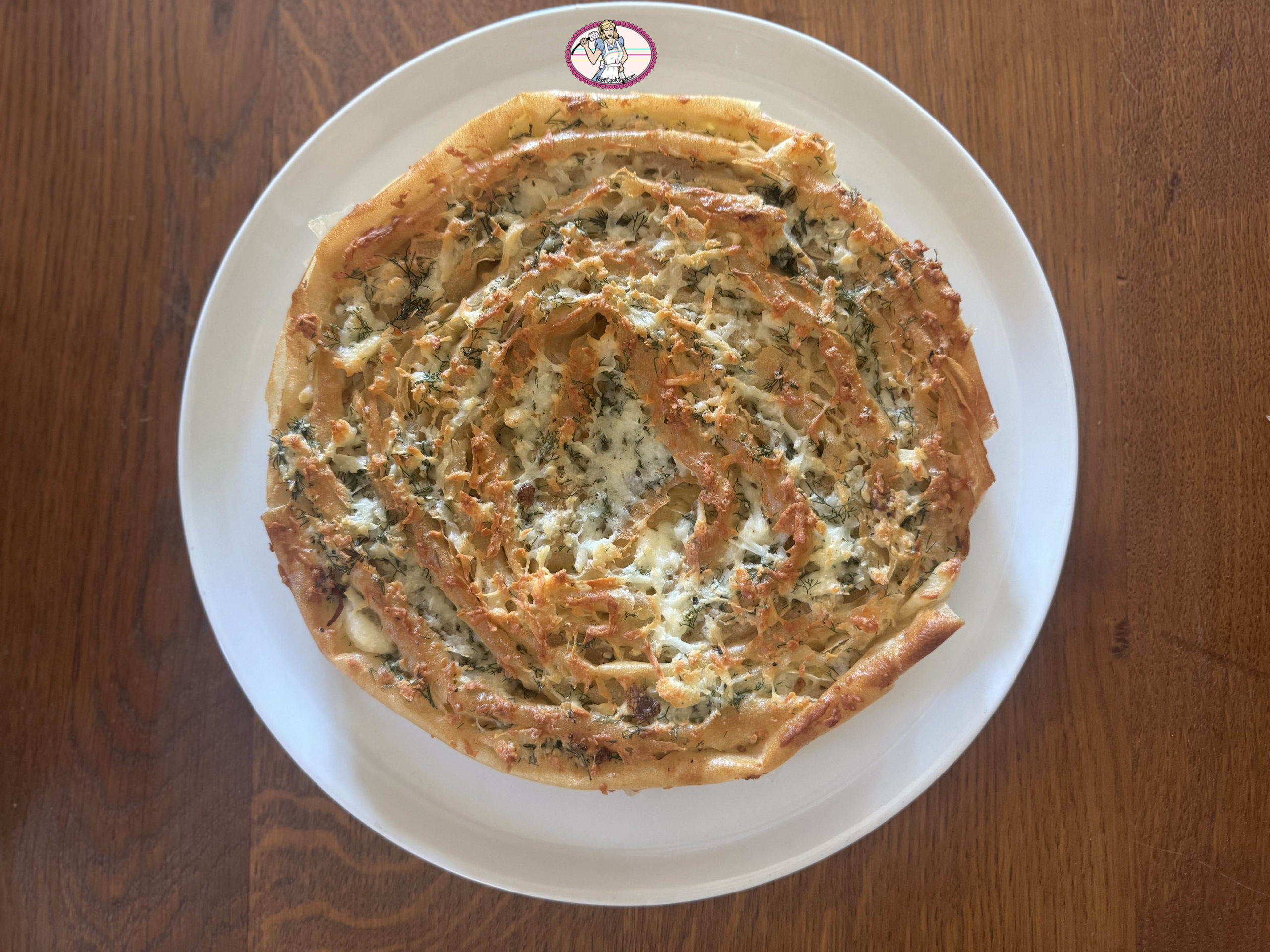 5. Enfourner la tarte telle quel +/- 10 minutes à four préchauffé à 170°. Les feuilles doivent être dorées.