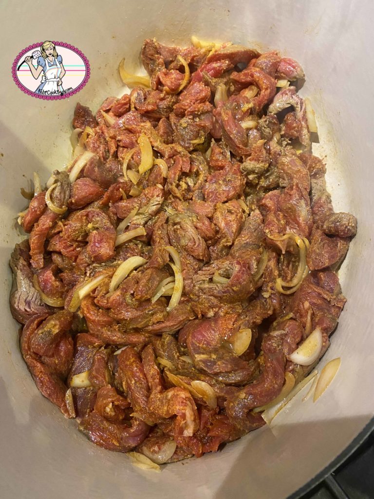 5. Le lendemain, verser deux cuillers à soupe d’huile dans votre cocotte et faire revenir la viande et les oignons sur feu vif pendant dix minutes environ.