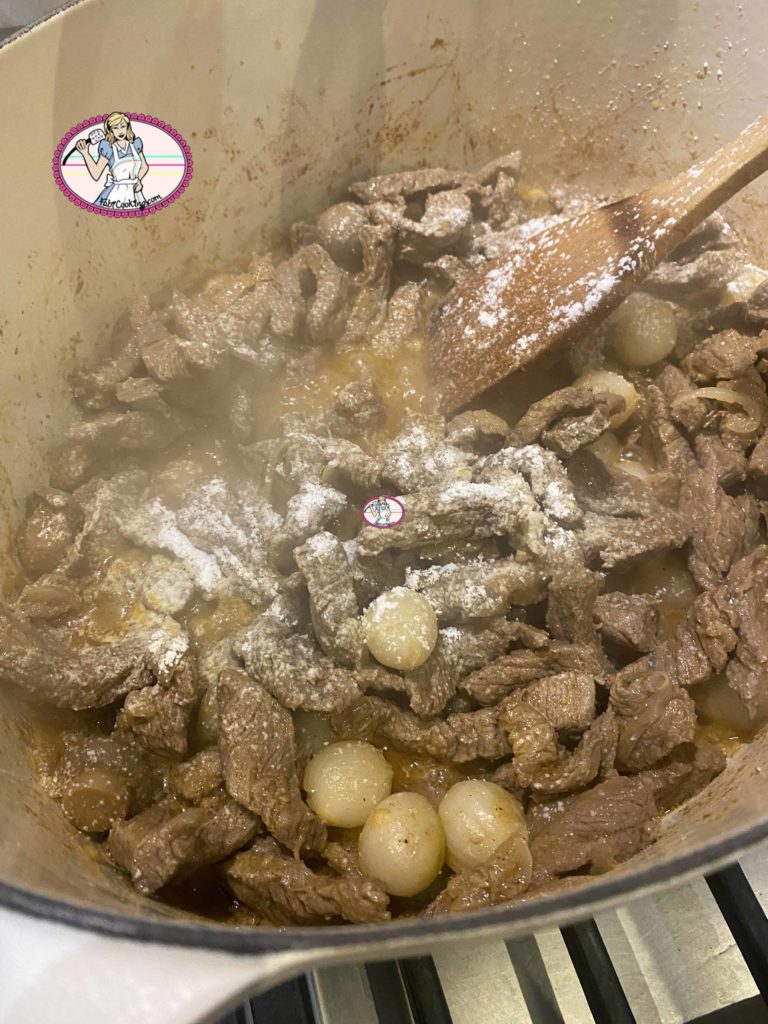 7. Saupoudrer de fécule et de fond de veau avant de rajouter le reste de vin et l’eau.