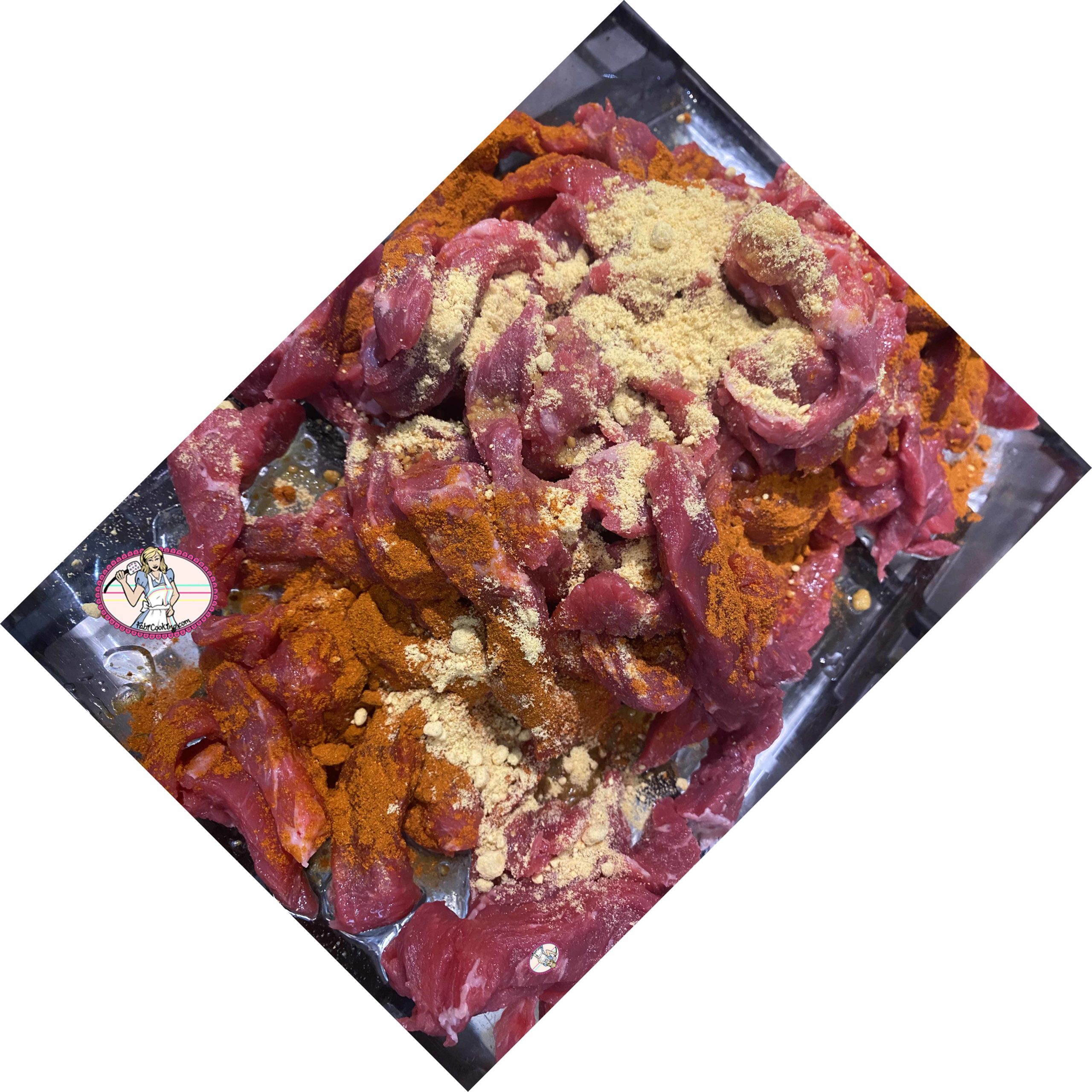 4. Verser l’huile neutre (3 cuillers à soupe environ) et mélanger en veillant à ce que tous les morceaux de viande soient bien recouvert. Quelques pincées de sel et quelques tours de moulin à poivre. Placer le tout dans une boite hermétique ou dans un plat en le recouvrant de film alimentaire et placer au frais une nuit.