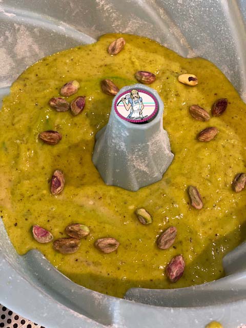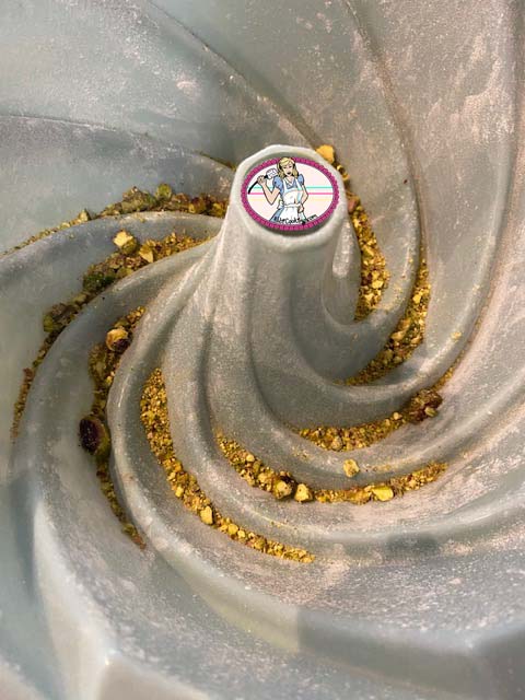 - Racler le fond de la cuve, donner un dernier tour au batteur. Dans le moule à bundt beurré de bas en haut, très légèrement fariné, placer quelques pistaches grossièrement coupées .
