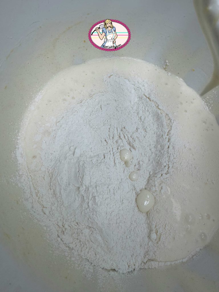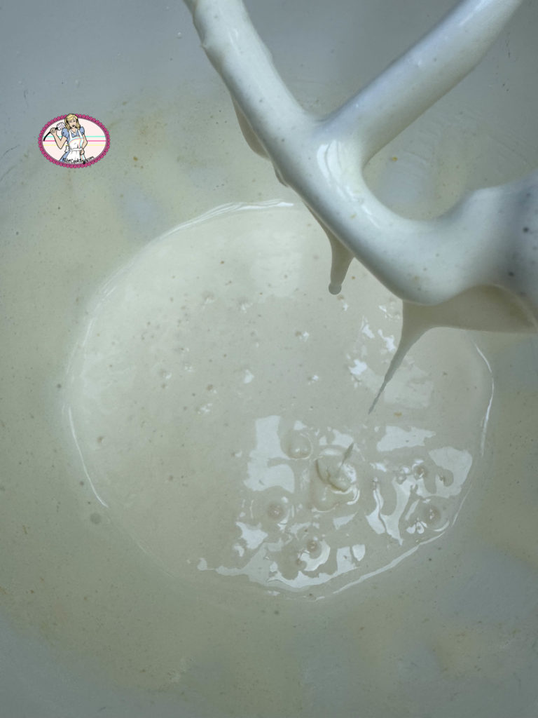 - Ajouter la farine tamisée ( en gardant l’équivalent d’une cuiller à soupe) et la levure chimique en continuant à fouetter et jusqu’a ce que vous obteniez un appareil lisse.