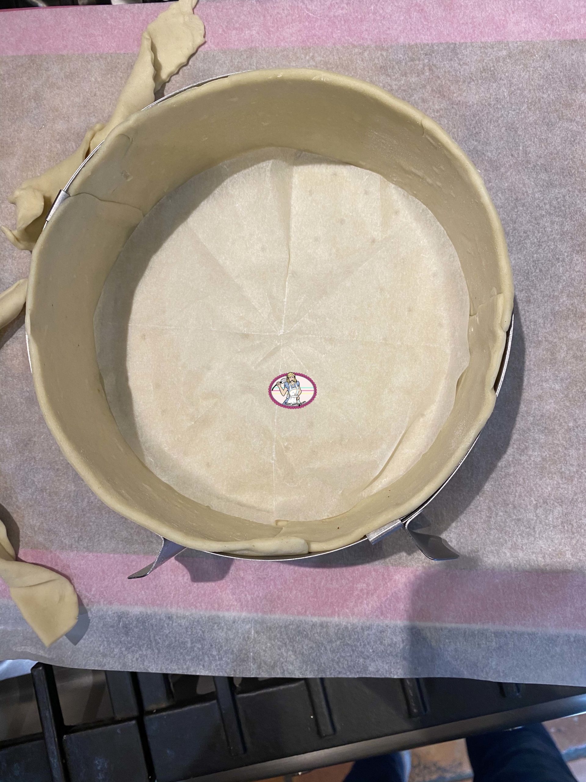 - Beurrer et fariner un cercle à entremets d’une hauteur de 6 à 8 cm. Découper la pâte à l’aide du bord tranchant du moule qui servira ici de gabarit. Placer ce morceau dans le fond puis confectionner des bandes de pâte plus hautes d’un centimètre pour le pourtour du cercle . Bien marquer la jointure des pâtes pour une soudure parfaite. Poser un papier cuisson sur le fond ainsi que des billes en céramique, du riz ou des haricots secs en quantité. Idéalement, pour éviter le genre de déconvenue que j’ai rencontré et si vous voulez donner une belle hauteur à votre flan, tapisser de film alimentaire supportant la chaleur tout l’intérieur du moule. Emprisonner du riz à ras bord de moule: la pâte ne glissera plus. Réserver une demie heure au frais ( au congélo, c’est encore mieux) puis égaliser le bord à l’aide d’une lame fine de couteau.