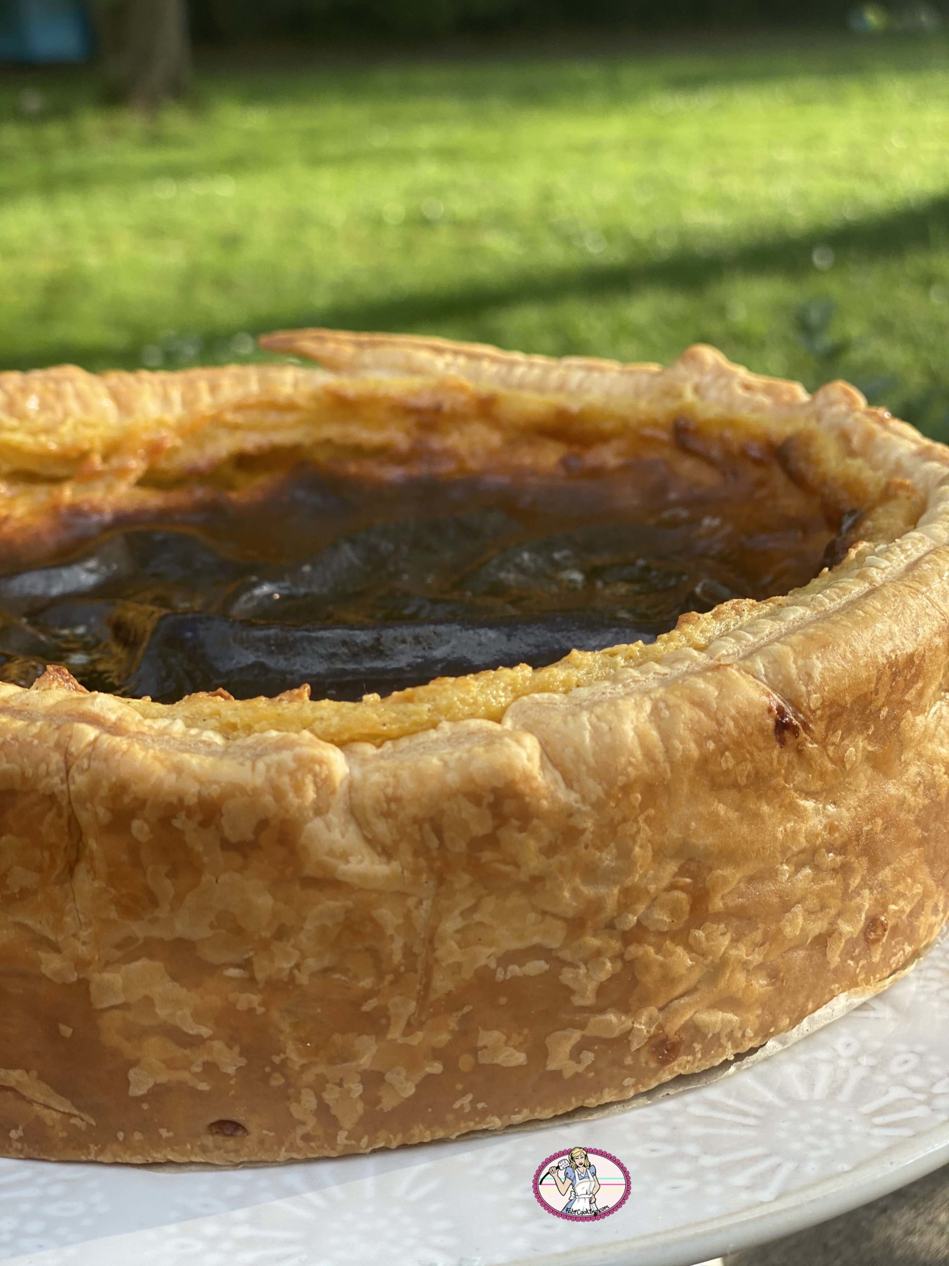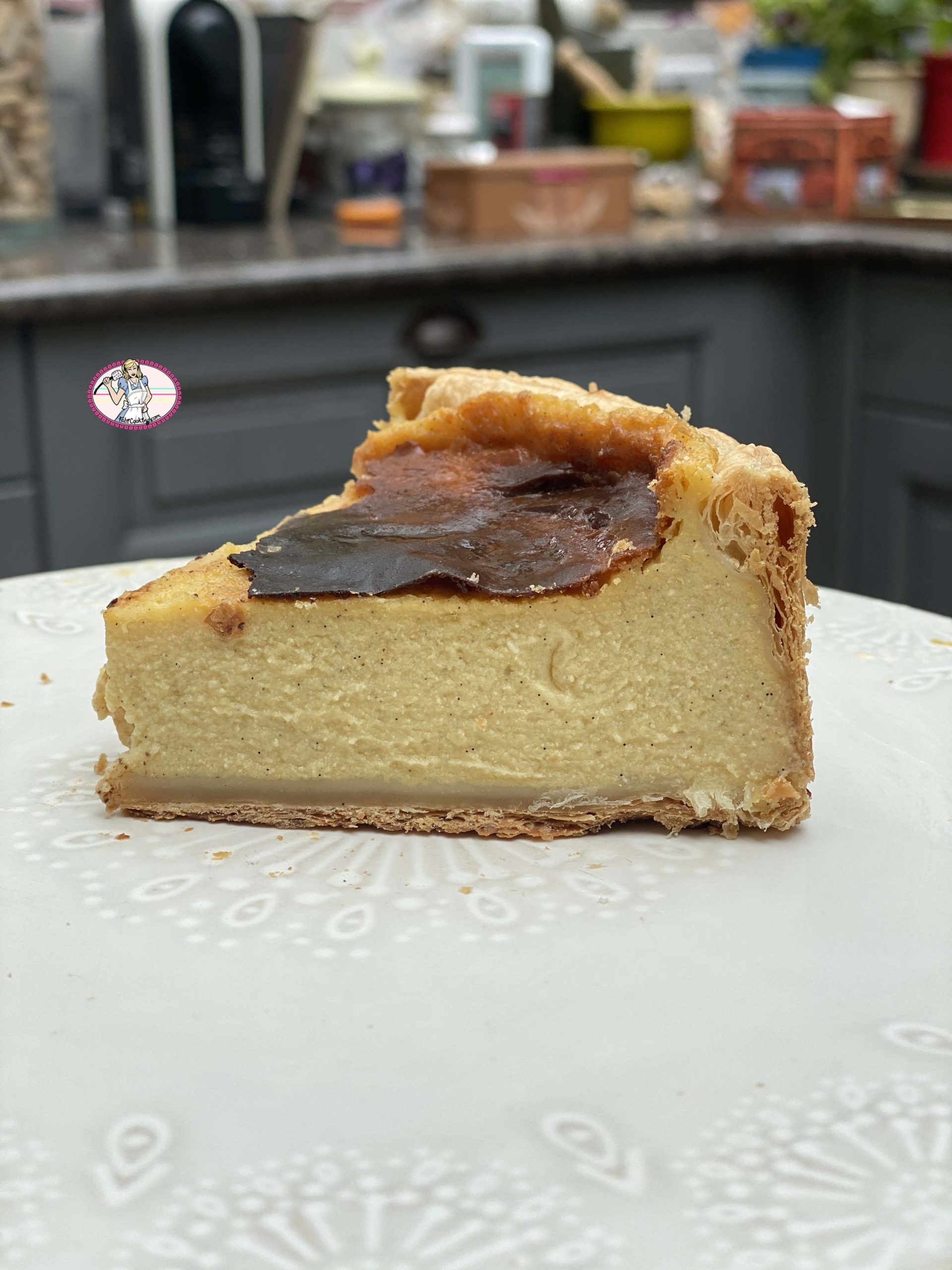 Pour ce qui est de la pâte utilisée, vous pouvez préparer le flan pâtissier avec de la pâte brisée, de la sablée ( je ne suis pas fan) ou comme moi avec de la feuilletée. Certains cuisent l’appareil à flan à cru ( c’est à dire sur une pâte non cuite au préalable ) d’autres non. Je pense qu’une cuisson à cru est plus simple avec une pâte brisée qu’avec une feuilletée plus délicate qui aura tendance à glisser à la cuisson. Pas de panique, il suffira de la presser contre les parois du moule et de la remonter et ça marche! Regardez la photo!